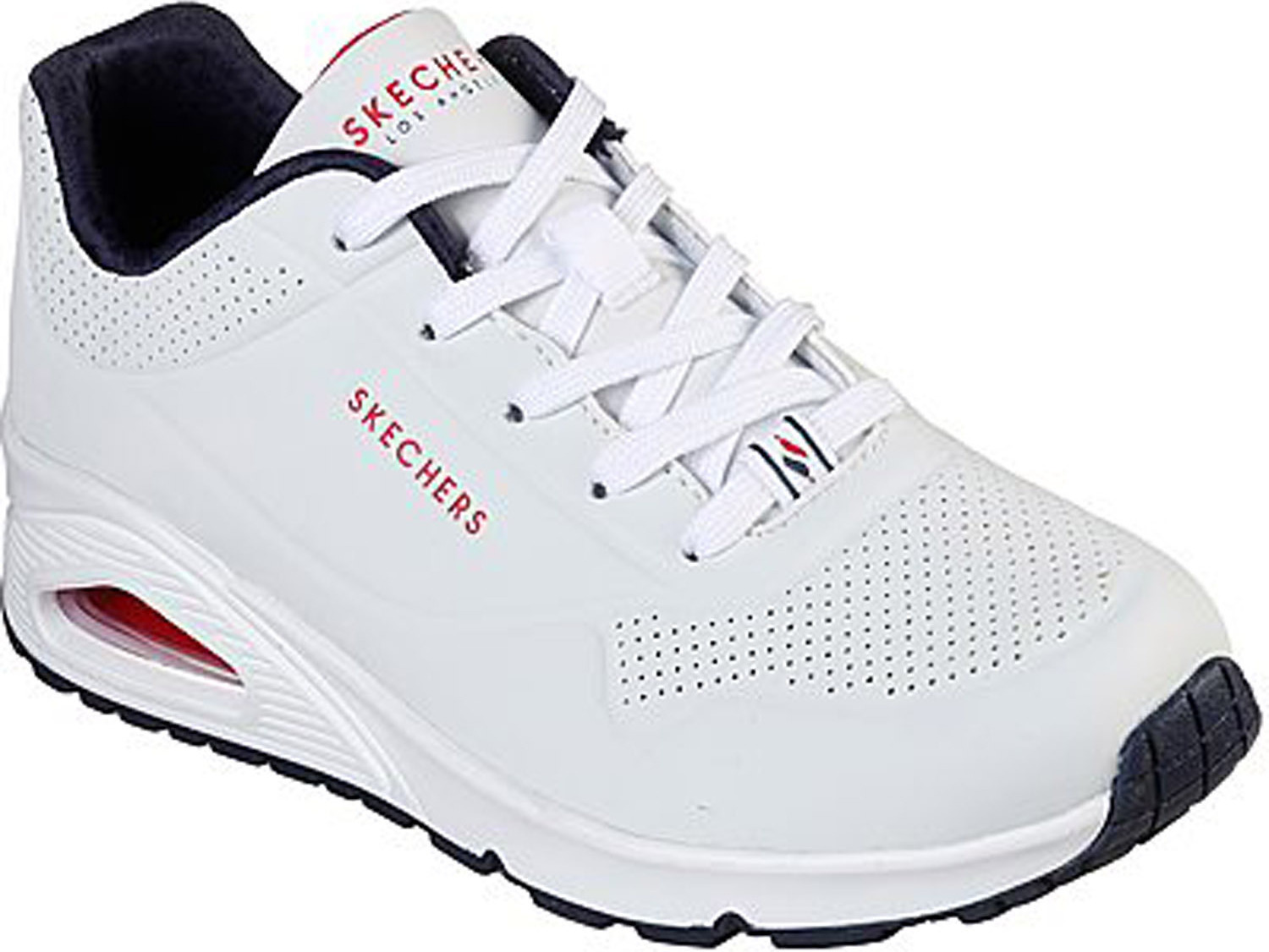 Die Skechers Uno - Stand on Air Wedgesneaker in der Farbe White sind die perfekten Begleiter für jeden Tag. Mit ihrer feinen Perforation und dem Obermaterial aus robustem und einfach zu reinigendem Lederimitat sind sie nicht nur optisch ansprechend, sondern auch äußerst praktisch. Das Innenleben des Schuhs, bestehend aus einer bequemen Vollausstattung aus Textil, sorgt für einen angenehmen Tragekomfort und ein Wohlgefühl bei jedem einzelnen Schritt. +