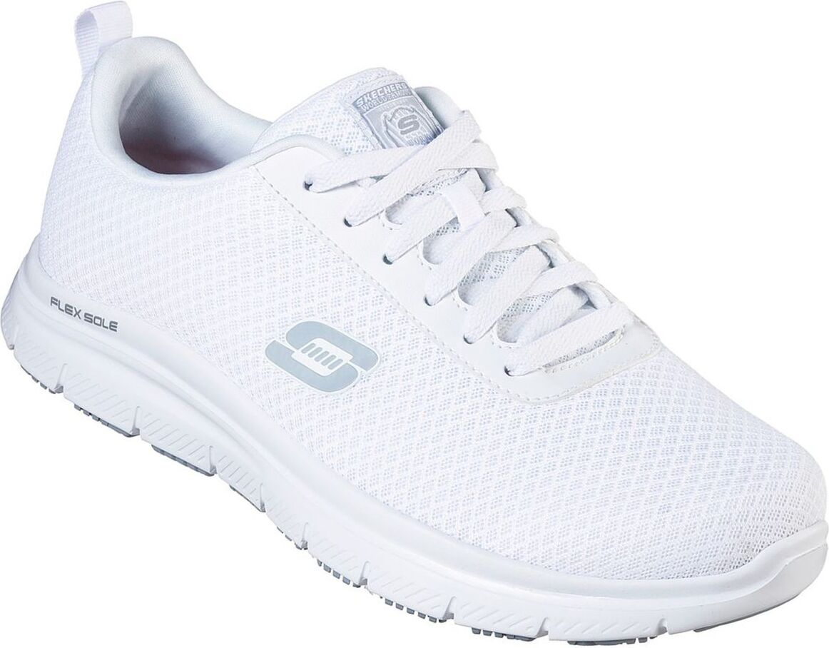 Der sportliche Stil des Schuhs verleiht Ihrem Arbeitsoutfit eine modische Note, während die gepolsterte Innensohle aus Textil eine weiche Unterstützung für Ihre Füße bietet. Mit der Dämpfungstechnologie des Skechers Memory Foams können Sie die Stoßbelastungen, die auf Ihre Füße einwirken, effektiv mildern. Die rutschhemmende Gummi-Laufsohle verhindert, dass Sie auf glatten Oberflächen ausrutschen und das leichte, profilierte Laufsohlenprofil sorgt für eine optimale Traktion.