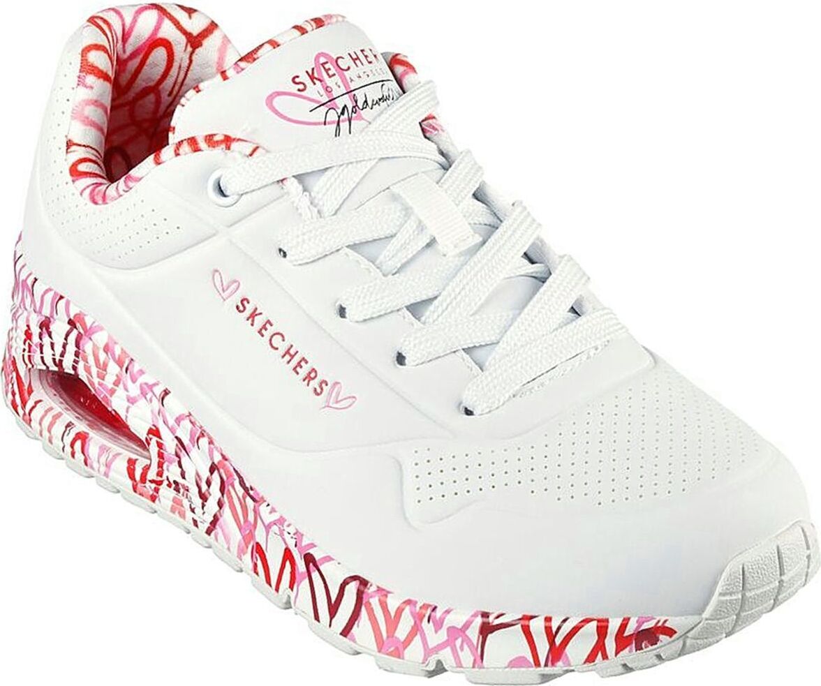 Der Sneaker ist zudem mit einem praktischen Schnürverschluss ausgestattet, der eine individuelle Passform ermöglicht. Egal ob beim Spaziergang in der Stadt oder beim Workout im Fitnessstudio, mit dem Skechers Uno Loving Love 155506 bist du immer stylish und bequem unterwegs.