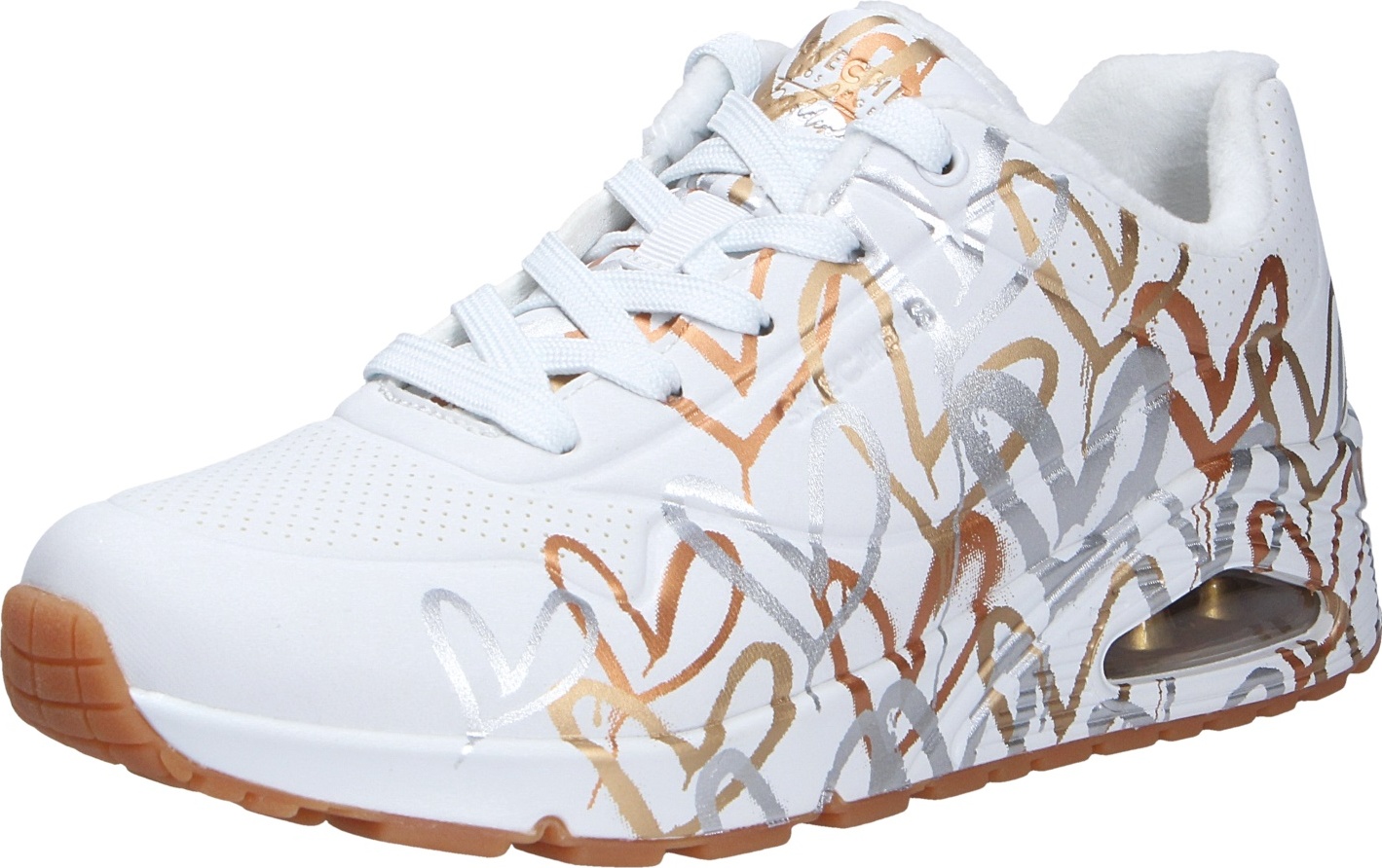 Die Skechers »UNO - METALLIC LOVE« Sneaker sind der Inbegriff von trendiger Sportlichkeit. Mit ihrem ausgefallenen Metallic-Print in Weiß-Gold setzen diese Sneaker ein modisches Statement und verleihen jedem Outfit das gewisse Extra. Das Obermaterial ist aus hochwertigem Lederimitat gefertigt, während das Innenmaterial aus weichem Textil besteht, das auch bei längeren Tragezeiten für ein angenehmes Tragegefühl sorgt. +