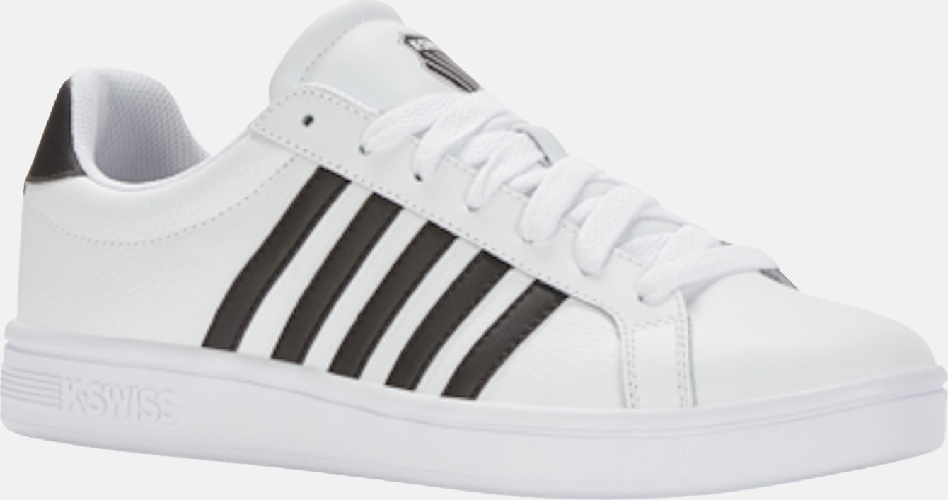 Mit dem K-Swiss Court Tiebreak Herren Sneaker in Weiß-Schwarz bringst du Stil und Komfort in deinen Alltag. Dieser trendige Schuh ist nicht nur ein Hingucker, sondern überzeugt auch durch seine hochwertige Verarbeitung. Das Obermaterial aus beschichtetem Leder sorgt für Langlebigkeit, während die perforierten Details für eine optimale Belüftung deines Fußes sorgen. +