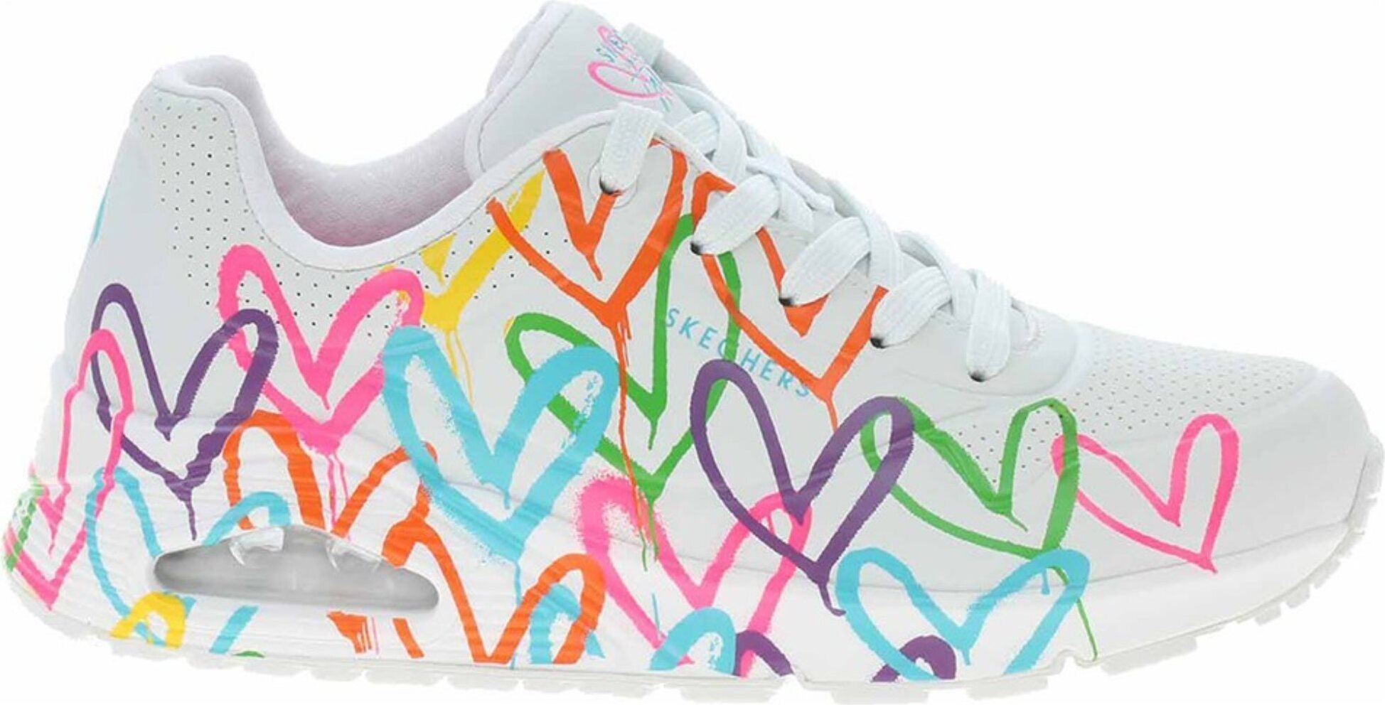 Mit den »UNO - HIGHLIGHT LOVE« Sneakern von Skechers gibst du deiner Outfit-Kreation das gewisse Extra. Der farbenfrohe Herzchen-Print auf dem weißen Lederimitat und Textil-Obermaterial sorgt für Aufmerksamkeit und ist ein echter Hingucker. Kontrastfarbene Details setzen zusätzlich Akzente. Der Sneaker ist im casual Stil gehalten und zeigt sich mit Logoschriftzug sowie Print-Details. +