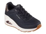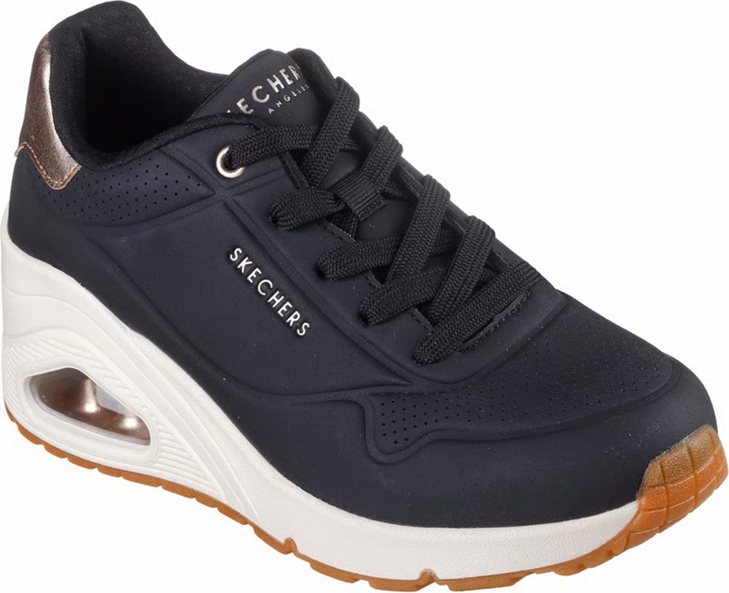 Entdecken Sie den ultimativen Mix aus Stil und Komfort mit dem Skechers UNO WEDGE-HI STEPS Sneaker in elegantem Schwarz. Dieser Keilsneaker ist mehr als nur ein modisches Accessoire – er ist Ihr treuer Begleiter für einen souveränen Auftritt im Alltag und besondere Anlässe. Das hochwertige Obermaterial aus langlebigem Durabuck, kombiniert mit schimmerndem Duraleder in Metallic-Optik, verleiht dem Schuh eine moderne und elegante Ausstrahlung, die alle Blicke auf sich zieht. +