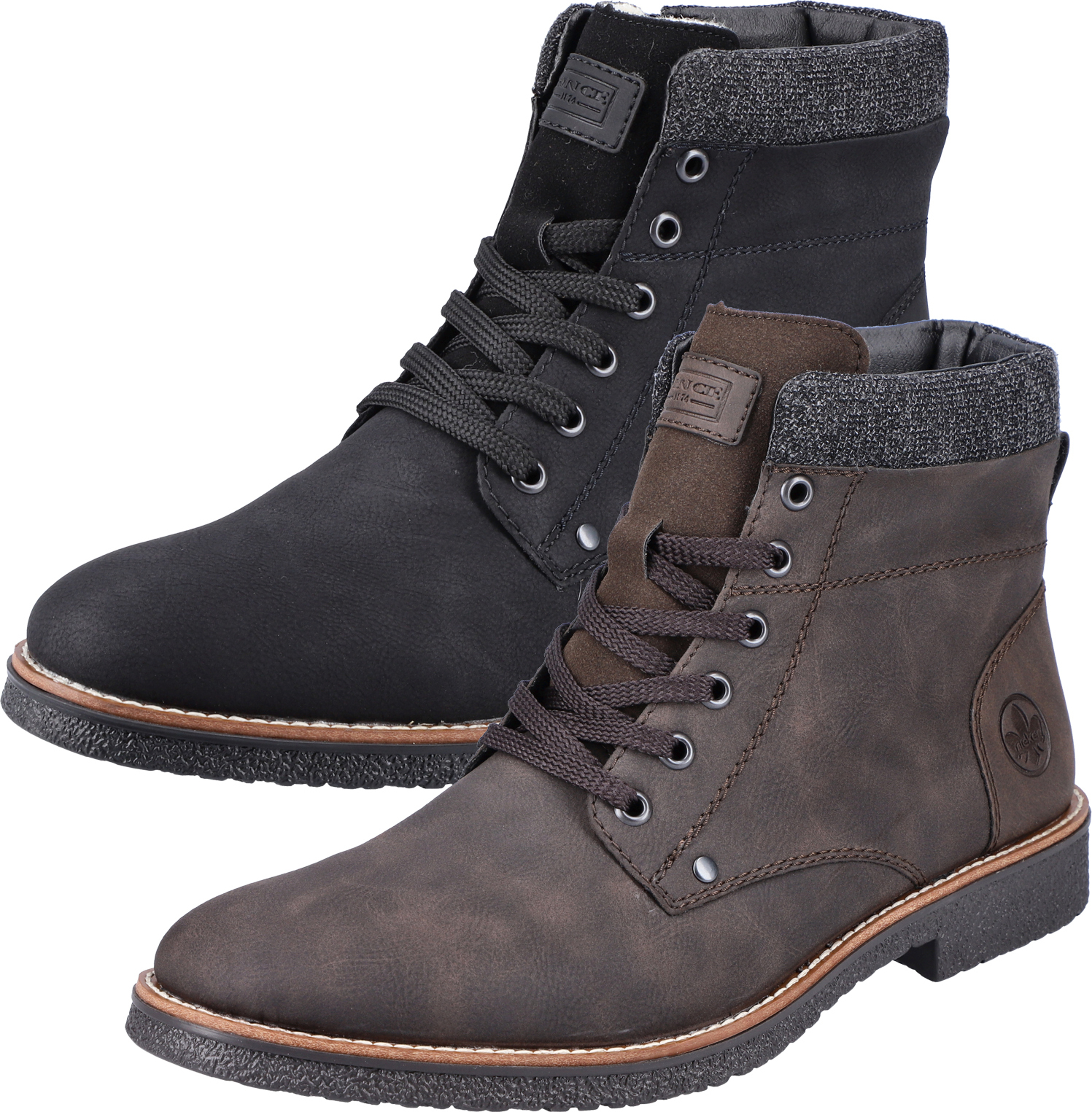 Entdecken Sie unsere hochwertige Rieker Schnürstiefelette in eleganter Schwarznuance. Das Obermaterial besteht aus Lederimitat und ist mit einer Logoprägung sowie dekorativen Kontrastnähten verziert. Doch nicht nur optisch überzeugt diese Stiefelette, sondern auch durch ihr wärmendes Schurwollfutter. Kein Frieren mehr an kalten Tagen! Die Stiefelette lässt sich bequem mithilfe einer Schnürung und einem Reißverschluss verschließen und hat eine runde Schuhspitze. +