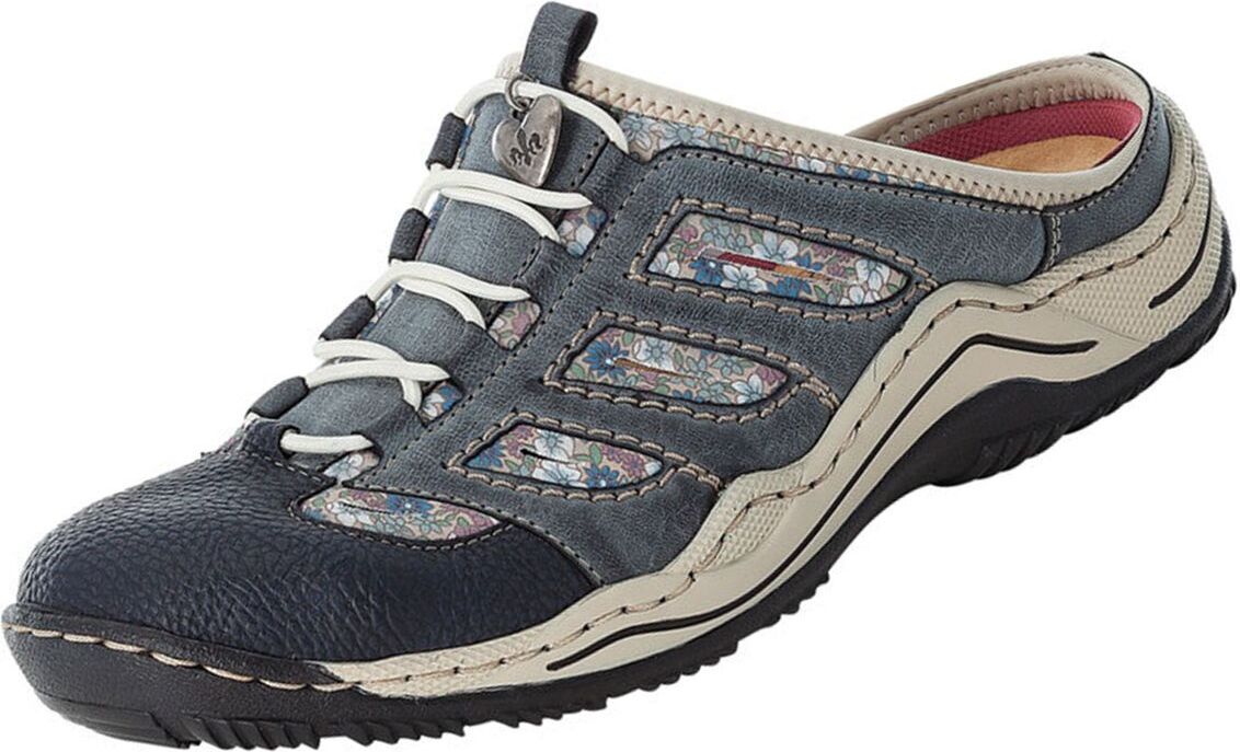 Mit dem Rieker Clog zum Schlupfen in einer trendigen jeansblau-dunkelblauen Farbkombination sind Sie immer top gestylt. Der sportliche Stil und die Ziersteppungen sorgen für eine lässige Note. Der Gummizug erleichtert das An- und Ausziehen und die Keilabsatzform gewährleistet einen angenehmen Tragekomfort. +