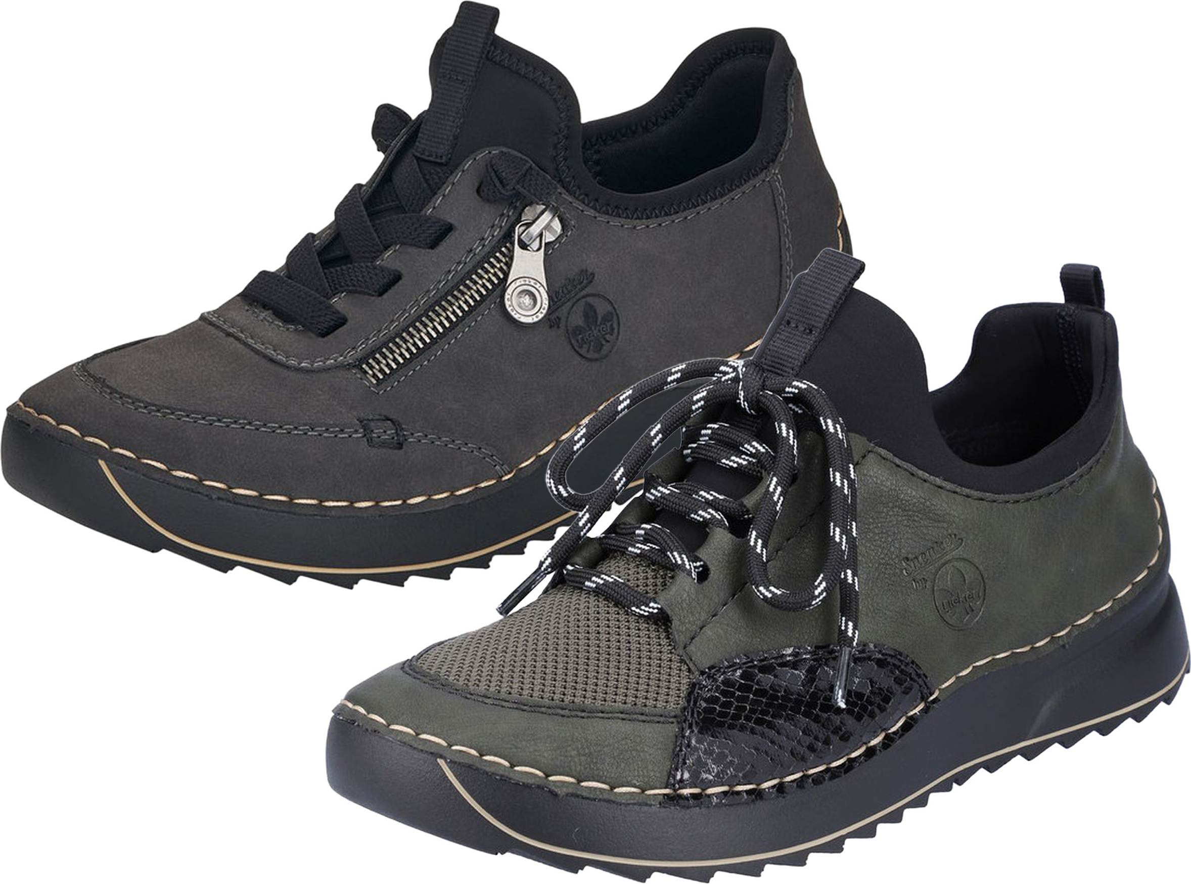 Dieser graue Rieker Sneaker vereint eine stilvolle Optik mit einem hervorragenden Tragegefühl. Das hochwertige Lederimitat bietet eine angenehme Haptik und ist zudem besonders langlebig. Ein zusätzlicher Hingucker ist der Zierreißverschluss und die Zierschnürung, die dem Schuh einen modischen Touch verleihen. Mit einem Gewicht von nur wenigen Gramm merkt man den Sneaker kaum am Fuß. +
