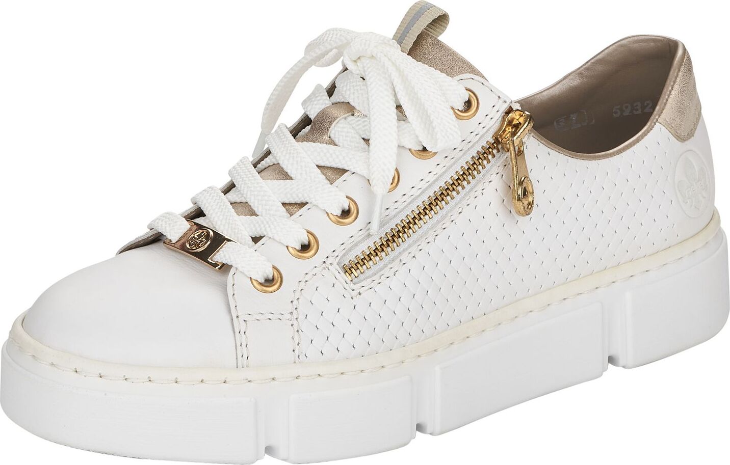 Die Rieker Plateausneaker in strahlend weißer Farbe sind ein sportlicher Hingucker, der durch goldfarbene Details aufgewertet wird. Mit einer Größe von 40 und einem EU-Größensystem bieten sie einen optimalen Tragekomfort. Die Absatzhöhe von ca. 3 cm und die Plateausohle geben Ihnen einen zusätzlichen Schub und verleihen Ihrem Outfit das gewisse Etwas. +