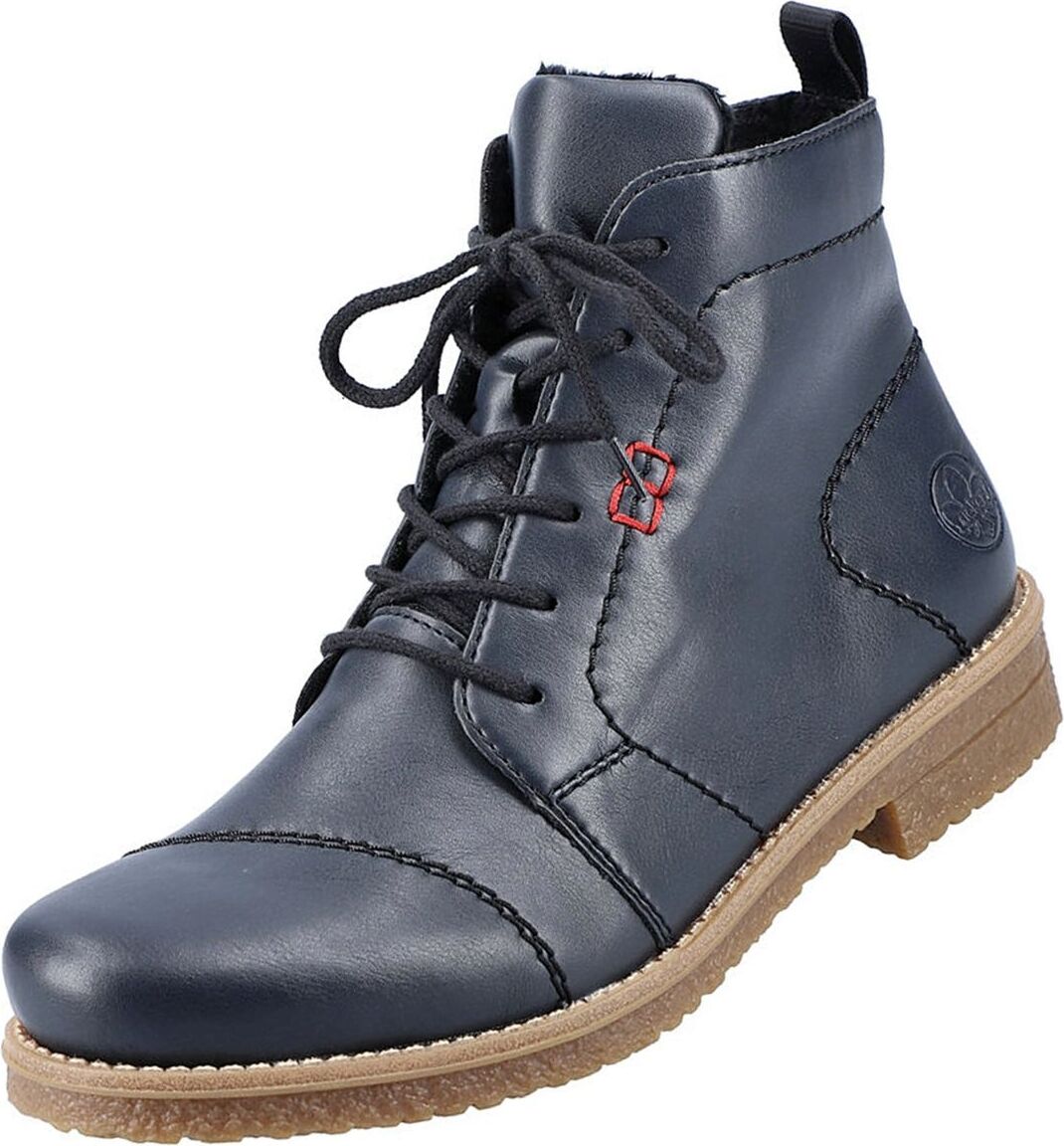Die Rieker Schnürstiefelette in dunkelblau ist ein klassischer Schuh, der durch seine honigfarbene Laufsohle zum Hingucker wird. Das Obermaterial aus Lederimitat sorgt für ein angenehmes Tragegefühl, während das Innenmaterial aus Textil für zusätzlichen Komfort sorgt. Die Logoprägung und Ziernähte runden das elegante Design ab. +
