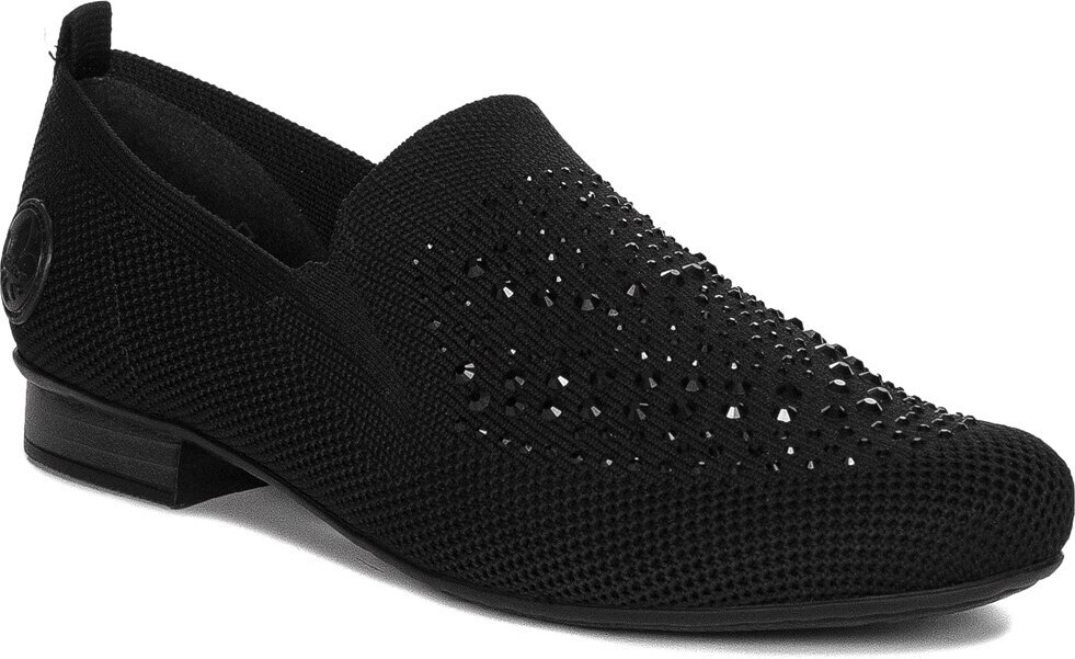 Perfektionieren Sie Ihren Business-Look mit diesen eleganten Rieker Slipper Loafers. In klassischem Schwarz gehalten und mit funkelnden Strass-Steinchen verziert, sind diese Schuhe ein echter Blickfang. Das Obermaterial aus Textil in Strickoptik verleiht den Slippern eine besondere Note. +