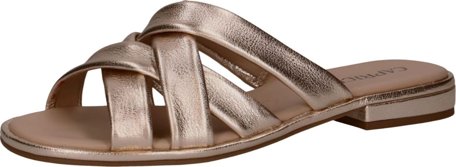 Entdecken Sie den perfekten Sommerschuh für stilbewusste Damen: die Caprice Pantolette mit eleganter goldfarbener Detailage. Dieser Schlupfschuh vereint zeitlose Leichtigkeit mit modernem Design und lädt dazu ein, den Sommer in absolutem Komfort zu genießen. Der robuste Blockabsatz sorgt für einen femininen Look und stabilen Halt, während das schlanke Design den Fuß besonders vorteilhaft zur Geltung bringt. +