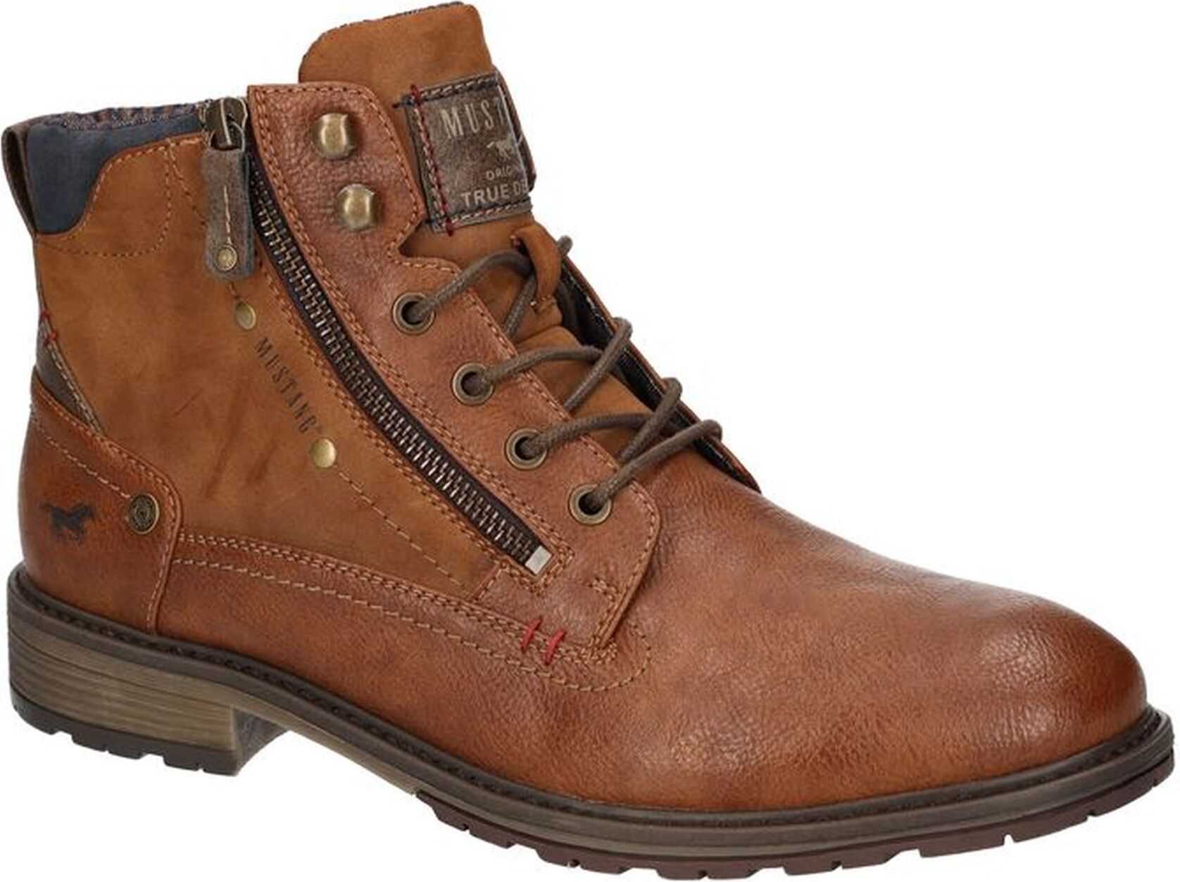 Der Mustang Shoes Schnürboot mit Reißverschluss ist ein brauner Schuh, der in Größe 41 erhältlich ist. Er ist in der Farbe cognacfarben gehalten und besteht aus hochwertigem Lederimitat und Nubuklederimitat. Das Innenmaterial besteht aus weichem Textil, das für hohen Tragekomfort sorgt. +