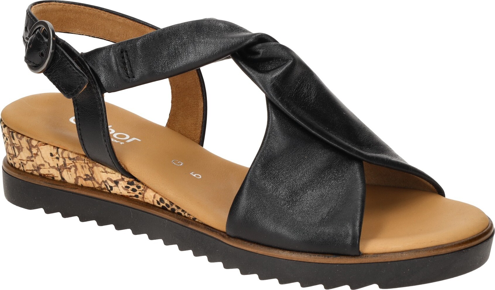 Entdecken Sie die Gabor Comfort Sandale in klassischem Schwarz – Ihr perfekter Begleiter für sonnige Tage! Diese exquisite Keilsandalette kombiniert mühelos zeitloses Design mit unvergleichlichem Komfort. Der hochwertige schwarze Lederoberfläche verleiht Ihrem Outfit eine elegante Note und macht diese Sandalen vielseitig einsetzbar, egal ob für einen Stadtbummel oder eine Gartenparty. +