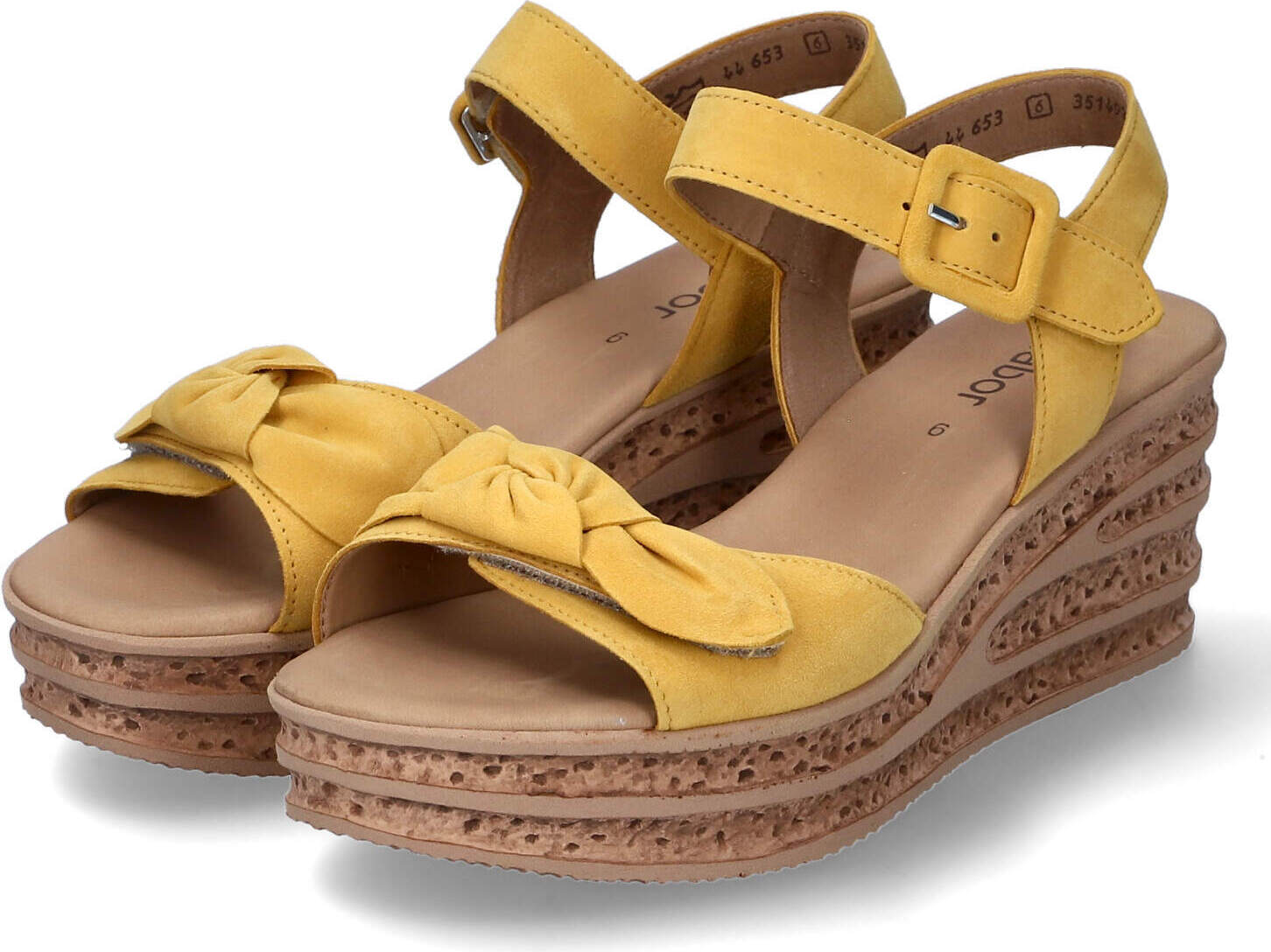 Die Gabor 44.653.13 Sandalette ist der perfekte Begleiter für den Sommer! Das gelbe Echtleder in Kombination mit der braunen Sohle verleiht dem Schuh eine frische und moderne Optik. Das Innenfutter und die Innensohle aus Echtleder sorgen für einen hohen Tragekomfort, während die Polsterbrandsohle für zusätzliche Bequemlichkeit sorgt. Die extra leichte und flexible Laufsohle in Schwammoptik garantiert ein angenehmes Lauferlebnis. +