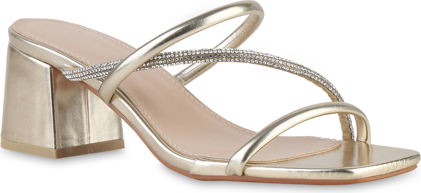 VAN HILL 841540 Sandalette Damen Pantoletten Sandaletten Strass Blockabsatz Freizeit (gold)