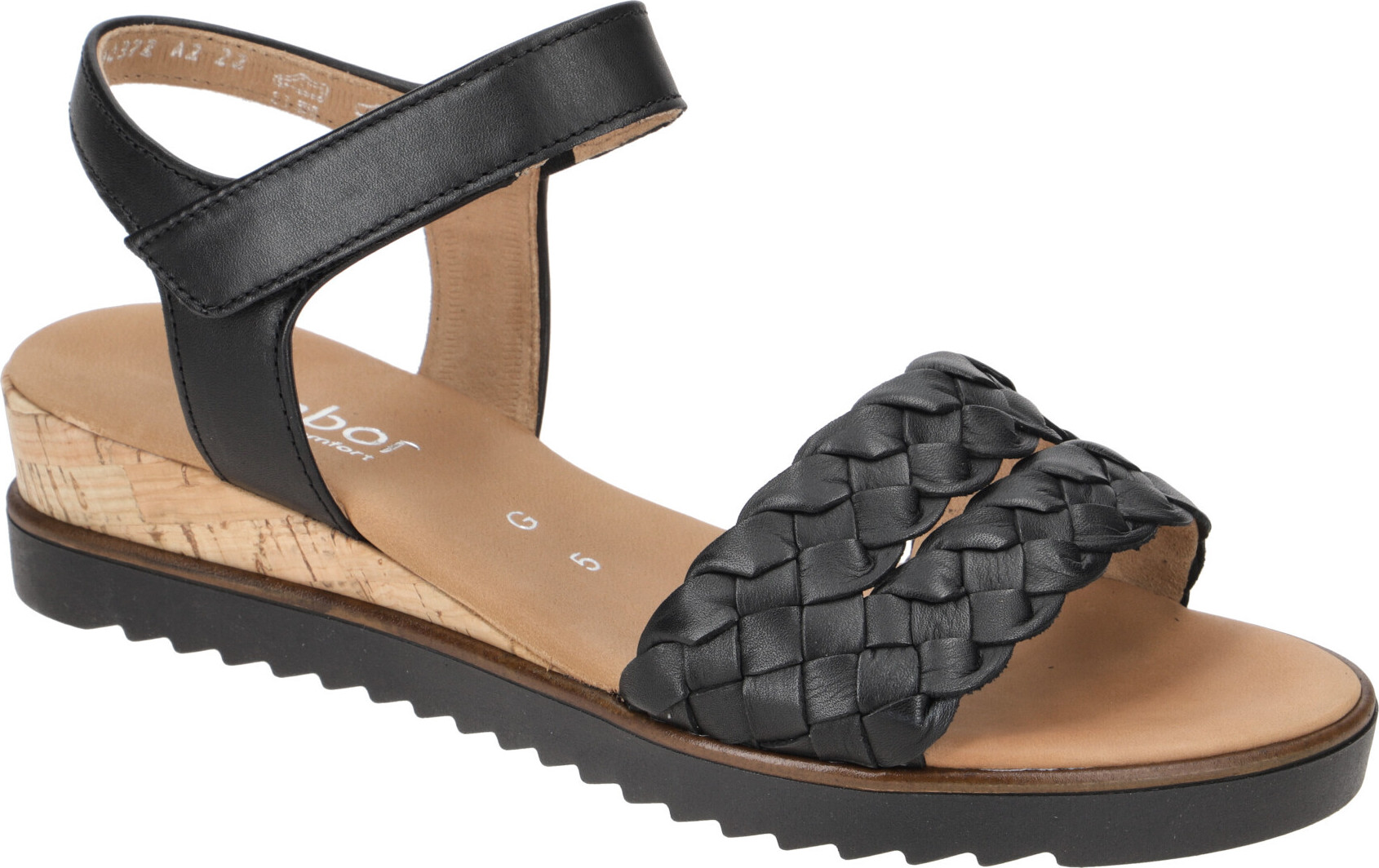 Entdecken Sie die perfekte Kombination aus Stil und Komfort mit der Gabor Keilsandalette in schimmerndem Schwarz. Das elegante Obermaterial aus langlebigem Glattleder verleiht jedem Outfit einen modernen Touch, während der modische Keilabsatz eine angenehme Höhe bietet, um Ihnen gleichzeitig Leichtigkeit und Stabilität zu schenken. Die funktionale Klettverschluss-Befestigung sorgt für individuelle Passform und unkompliziertes An- und Ausziehen – ideal für den aktiven Alltag. +
