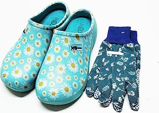 Damen Clogs in aqua mit Gänseblümchen mit den passenden Gartenhandschuhen in fröhlichen frischen Farben.Gemütlicher und vor allem rutschfester Gartenschuh. +