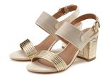 Das ist die Sandalette, auf die du gewartet hast - die LASCANA Sandalette mit Blockabsatz in Gold. Diese Schuhe sind eine perfekte Ergänzung für jede Sommergarderobe, dank des edlen Designs und der Materialzusammensetzung aus Lederoptik und Textil. Der praktische Schnallenverschluss ermöglicht es dir, diese Sandalen schnell und einfach anzuziehen und sie sitzen perfekt an deinem Fuß. Der breite Blockabsatz ist nicht nur stylisch, sondern auch bequem genug, um sie den ganzen Tag zu tragen. +