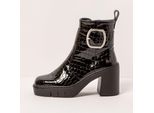 Das Obermaterial glänzendem Lacksynthetik sowie das Innenmaterial aus Mikrofaser sorgen für perfekten und komfortablen Tragekomfort zu jeder Jahres und Tageszeit. Der Reißverschluss sorgt für den leichten Einstieg und setzt diese Stiefelette auch noch stilvoll in Szene.