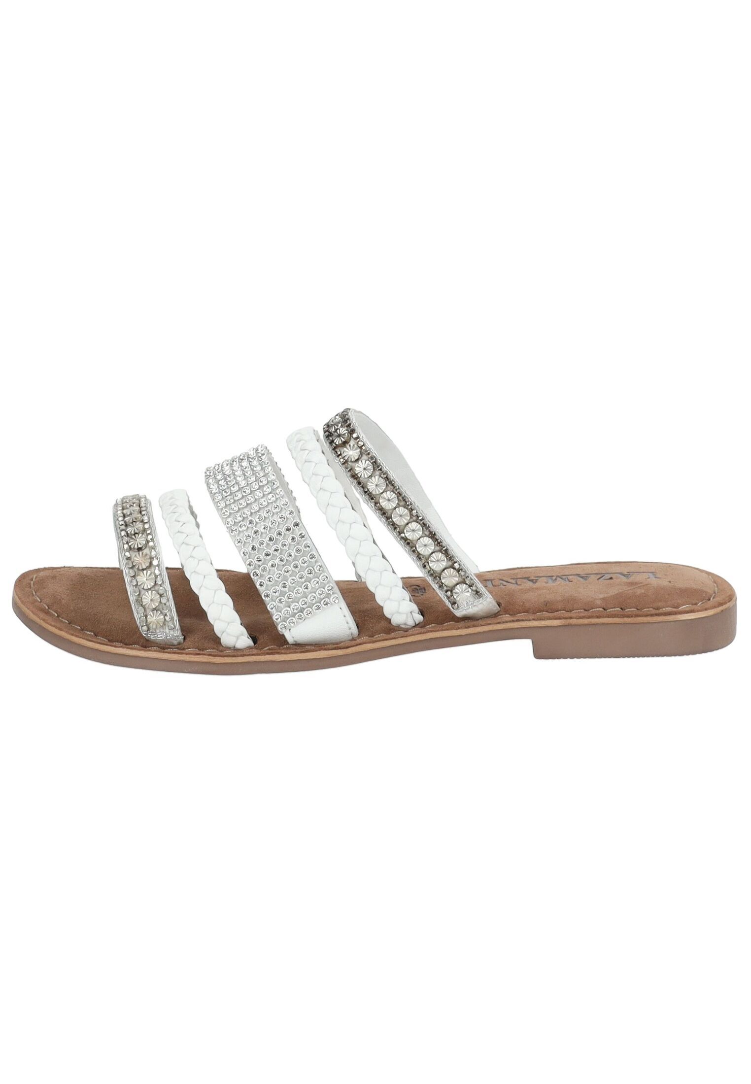Die unterschiedlich breiten Riemen aus hochwertigem Leder sind mit funkelndem Strass-Dekor verziert, was deinem Look einen individuellen, edlen Touch verleiht. Schnell hineingeschlüpft, lassen sich diese Schuhe im Handumdrehen zu deinem neuen Lieblingsstück machen – egal ob beim Spaziergang am Strand, beim Stadtbummel oder bei deinem nächsten Outdoor-Event.