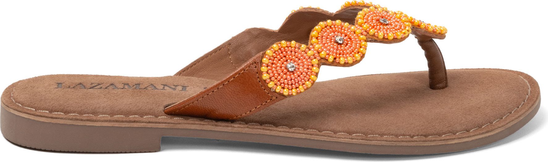 Entdecken Sie den perfekten Sommerbegleiter: den Lazamani Zehensteg Leder Zehentrenner in einem lebendigen Orange. Dieses modische It-Piece vereint Trendiness mit Komfort und setzt zugleich ein stylisches Statement. Die filigrane Perlenaufnähung verleiht der Sandale eine elegante Note und macht sie zum Blickfang an jedem Anlass. +