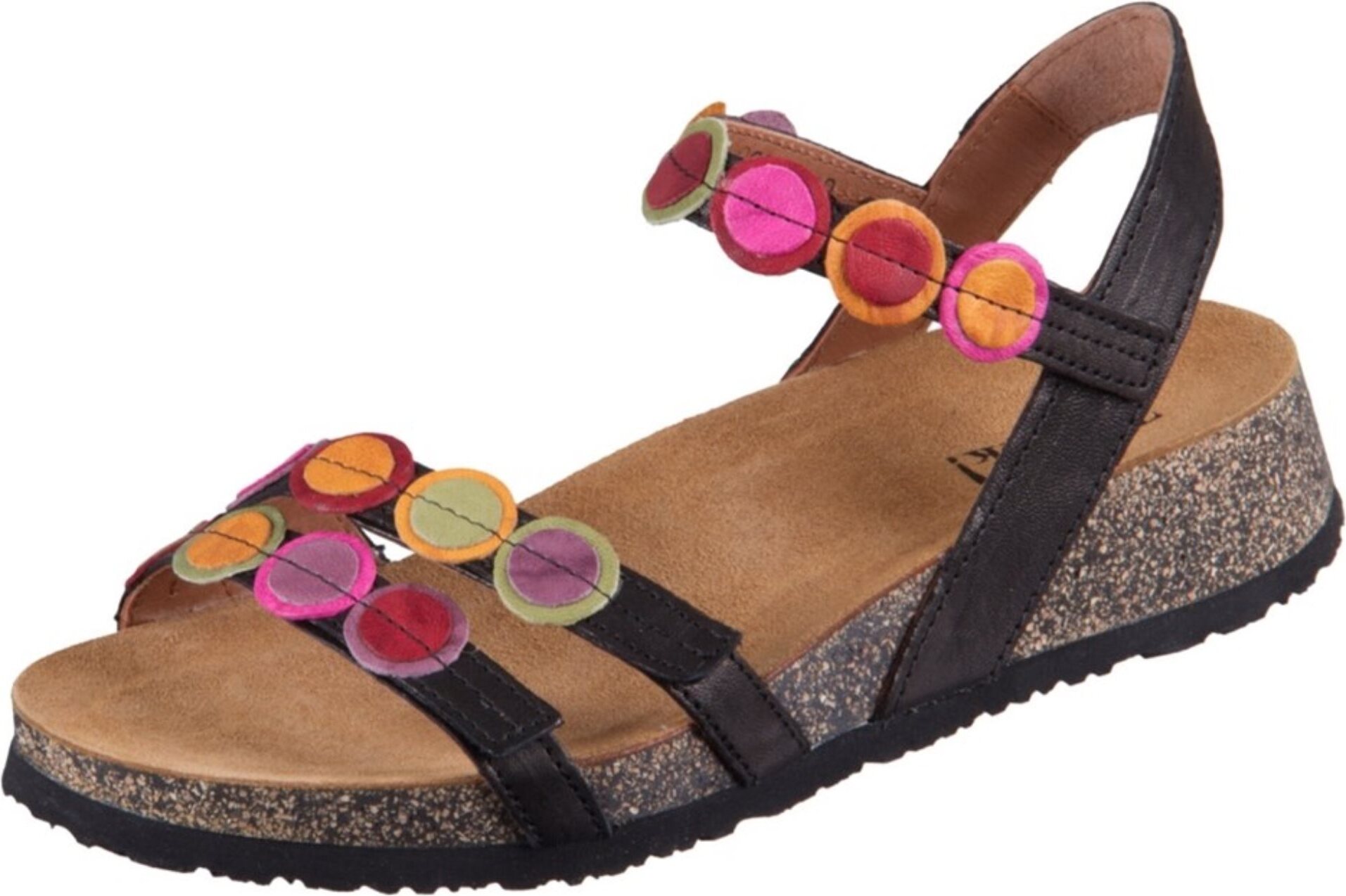 Die Think! »KOAK« Sandale in Größe 38 ist die perfekte Wahl für Frauen, die bunte und farbenfrohe Schuhe lieben. Ein echter Hingucker sind hier die vielfältigen Applikationen in unterschiedlichen Farben, die das schwarze Leder des Obermaterials perfekt ergänzen. Das Leder wurde hierbei auf nachhaltige Art und Weise vegetabil gegerbt, was für besondere Qualität und Langlebigkeit sorgt. Auch das Innenfutter besteht komplett aus Leder und garantiert somit besten Tragekomfort. +