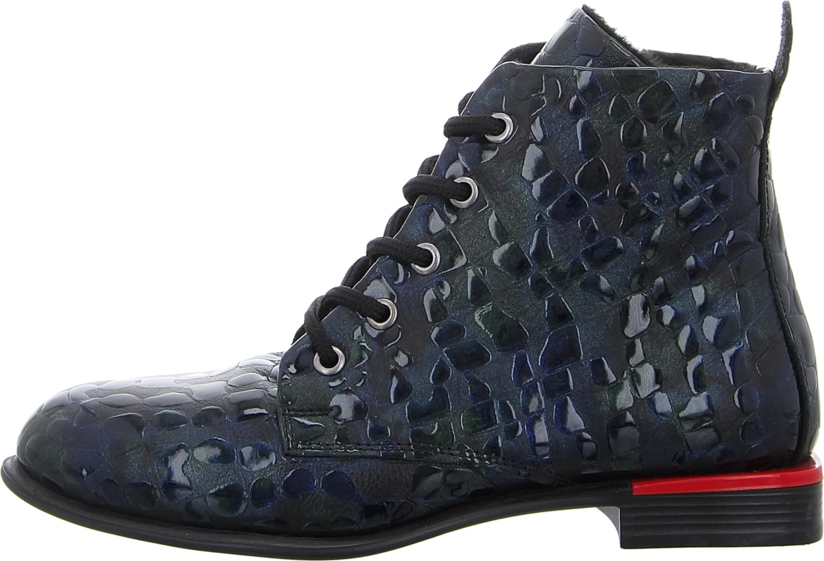 Ein besonderes optisches Highlight ist auch der Streifen in Rot am Absatz.Mit der Schnürung lässt sich der Schuh individuell an den Fuß anpassen und der seitliche Reißverschluss ermöglicht einen schnellen Ein- und Ausstieg.Das weiche Innenfutter sorgt auch an kälteren Tagen für warme Füße.Ein modisches Must Have für die Herbst Winter Saison!