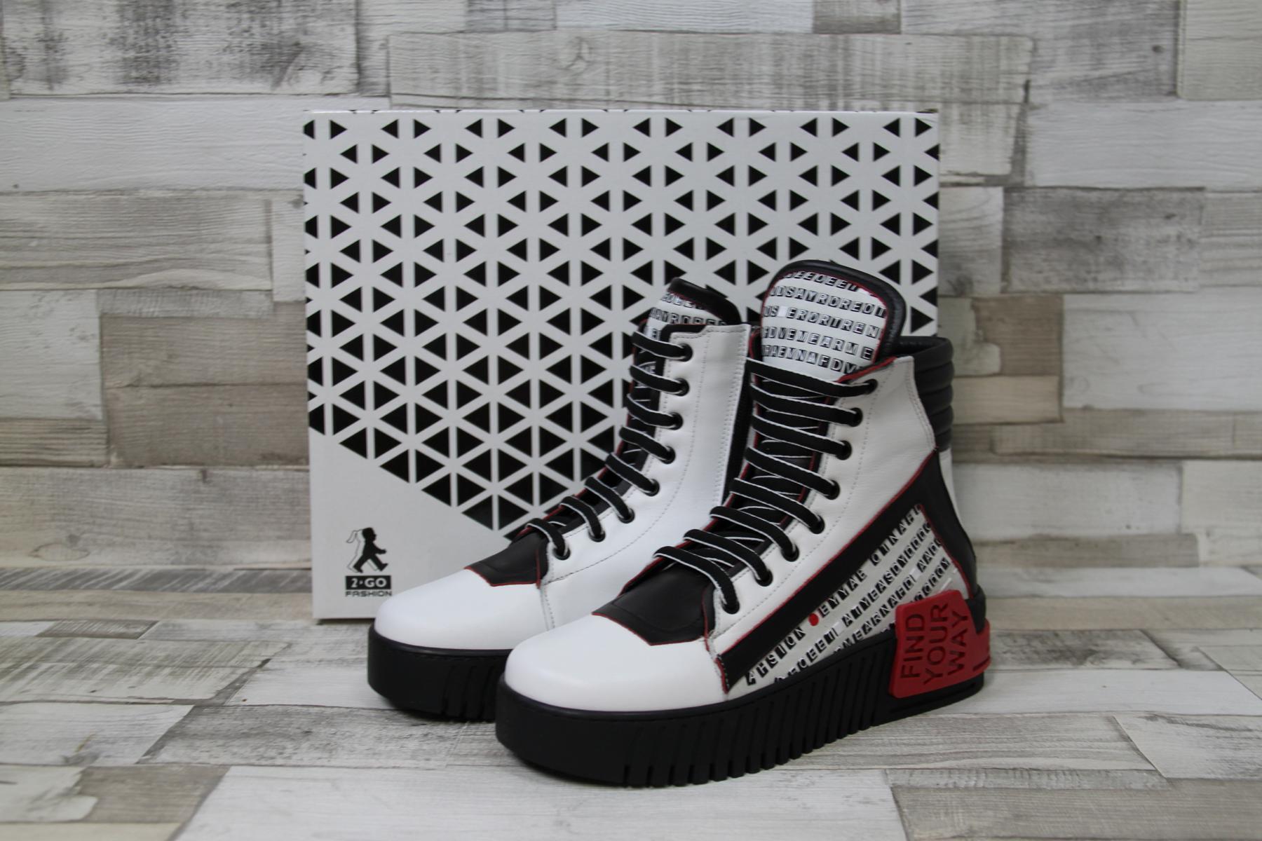 Modern und hochwertig ist dieser Damen Schnürboots aus dem Hause 2 Go Fashion.Das Obermaterial aus Glattleder in Weiß wird durch die Einsätze in Schwarz und den individuellen Print gekonnt in Szene gesetzt. +