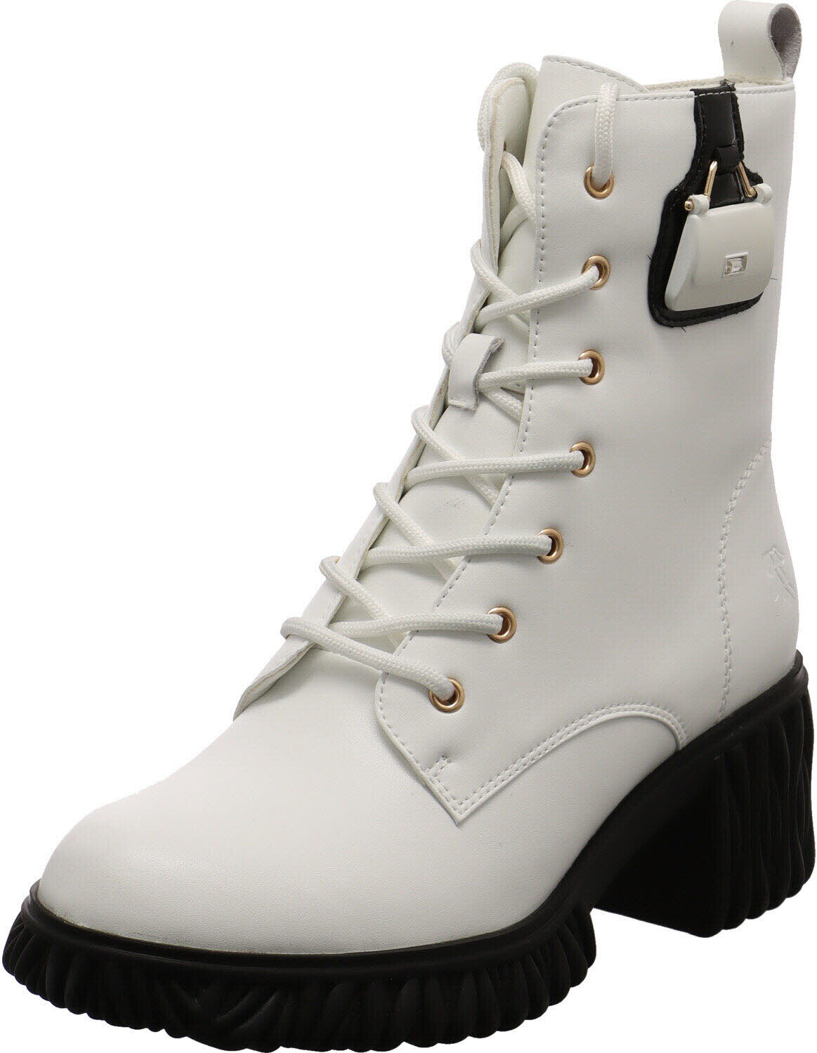 Wir sind ganz verliebt in diese tolle Damen Schnürstiefelette von 2 Go Fashion.Auch hier wurde hochwertiges Echtleder in Weiß verarbeitet. Toll zur Geltung kommt es, durch die abgesetzte Laufsohle mit dem hohen Blockabsatz in Schwarz, welcher eine individuelle Linienführung hat.Das Highlight ist jedoch die kleine aufgesetzte Deko Handtasche an der Außenseite vom Schaft, die mit einem Lack Einsatz in Schwarz unterlegt ist.