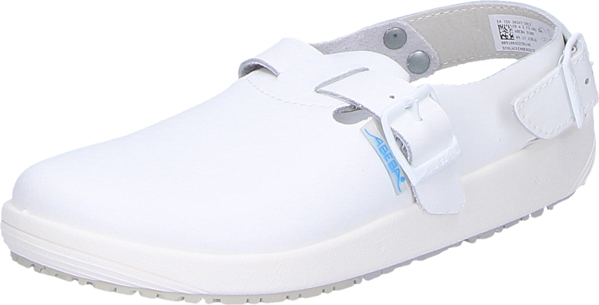 - Obermaterial: Glattleder, weiß- CE, EN ISO 20347:2012, OB, A, FO, SRC- Decksohle Leder- Fersenriemen feststehend, verstellbar- Ristbereich verstellbar- PU-Zwischensohle- Rutschhemmende Gummi-Laufsohle- Antistatisch- Gewicht: 1120g