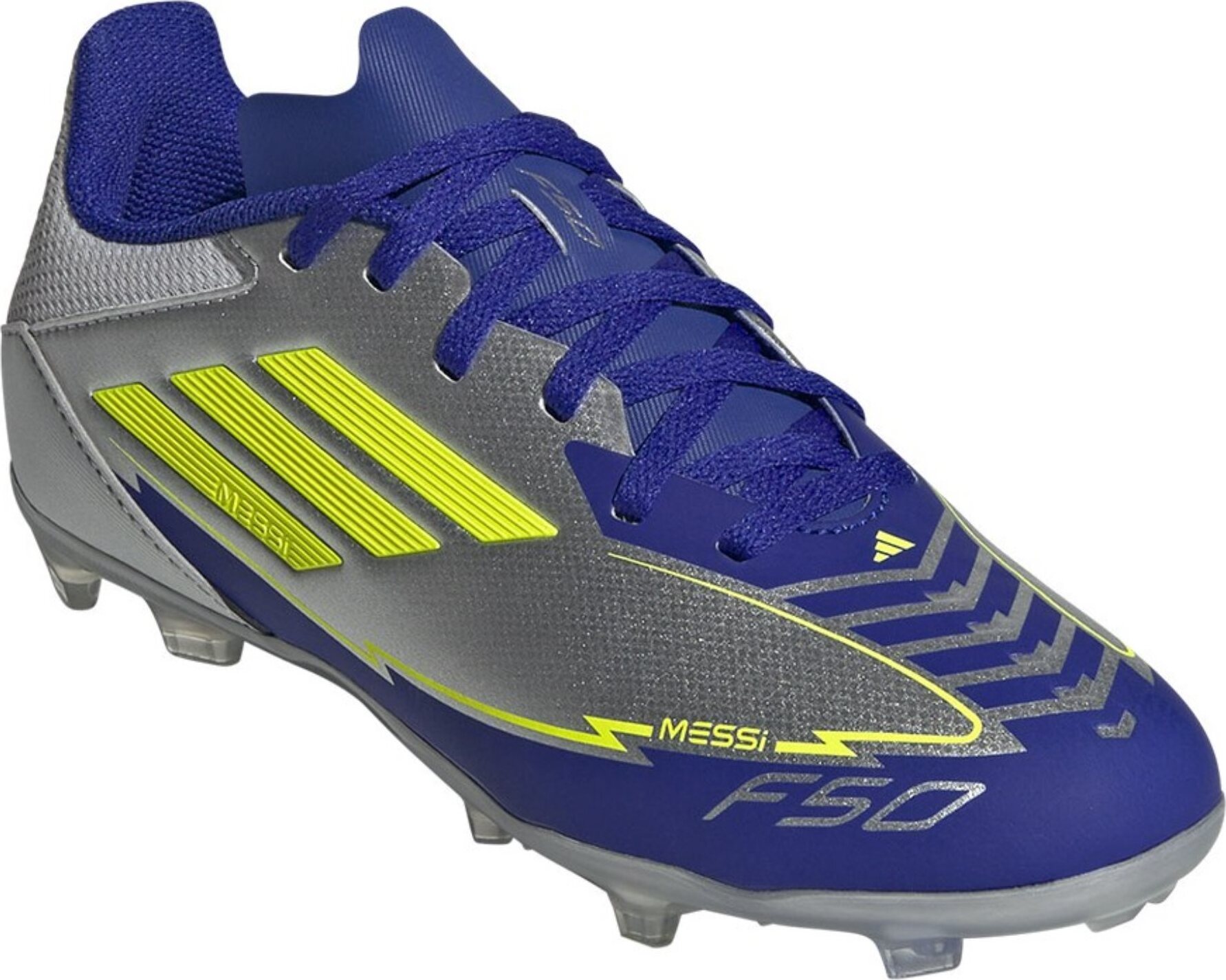 adidas performance F50 LEAGUE MESSI KIDS FG/MG Fußballschuh für Rasenplätze, für Kinder & Jugendliche (silber/gelb/blau)