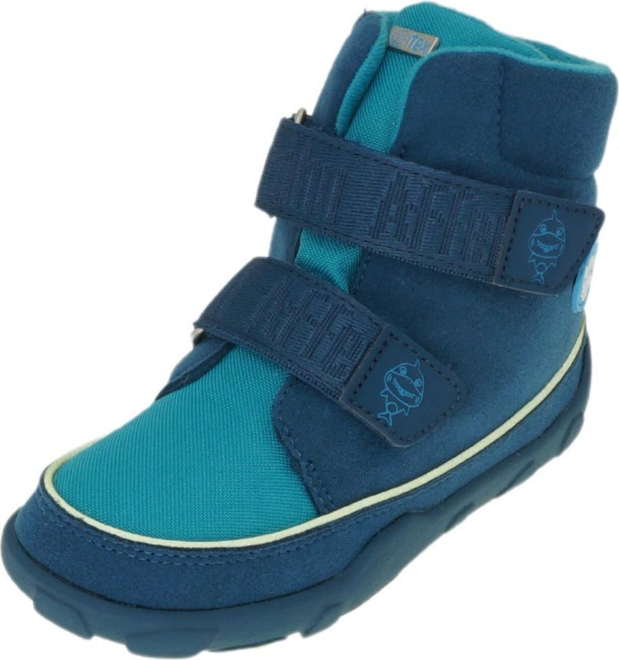 Das Modell Comfy Hai ist ein kindgerechter Barfußschuh für den Winter als Stiefel, aus dem Hause Affenzahn in trendigem Blau. +
