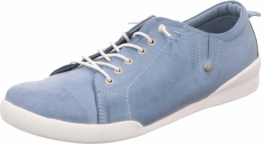 Ein sportiver Look und maximaler Komfort zeichnen diesen Damen Sneaker aus dem Hause Andrea Conti aus.Gefertigt aus weichem und flexiblem Echtleder in Blau begeistert der Schuh durch die Gummischnürung mit eingearbeitetem Silberfaden und das herausnehmbare Wechselfußbett.Die Sohle in Weiß und die seitliche Metall-Applikation runden den Look perfekt ab.Das Fußbett ist angenehm gepolstert und die Laufsohle besonders flexibel.Ein rundum gelungener Sneaker für jeden Anlass.
