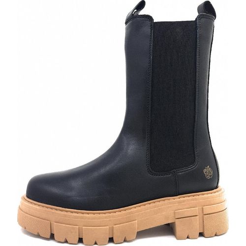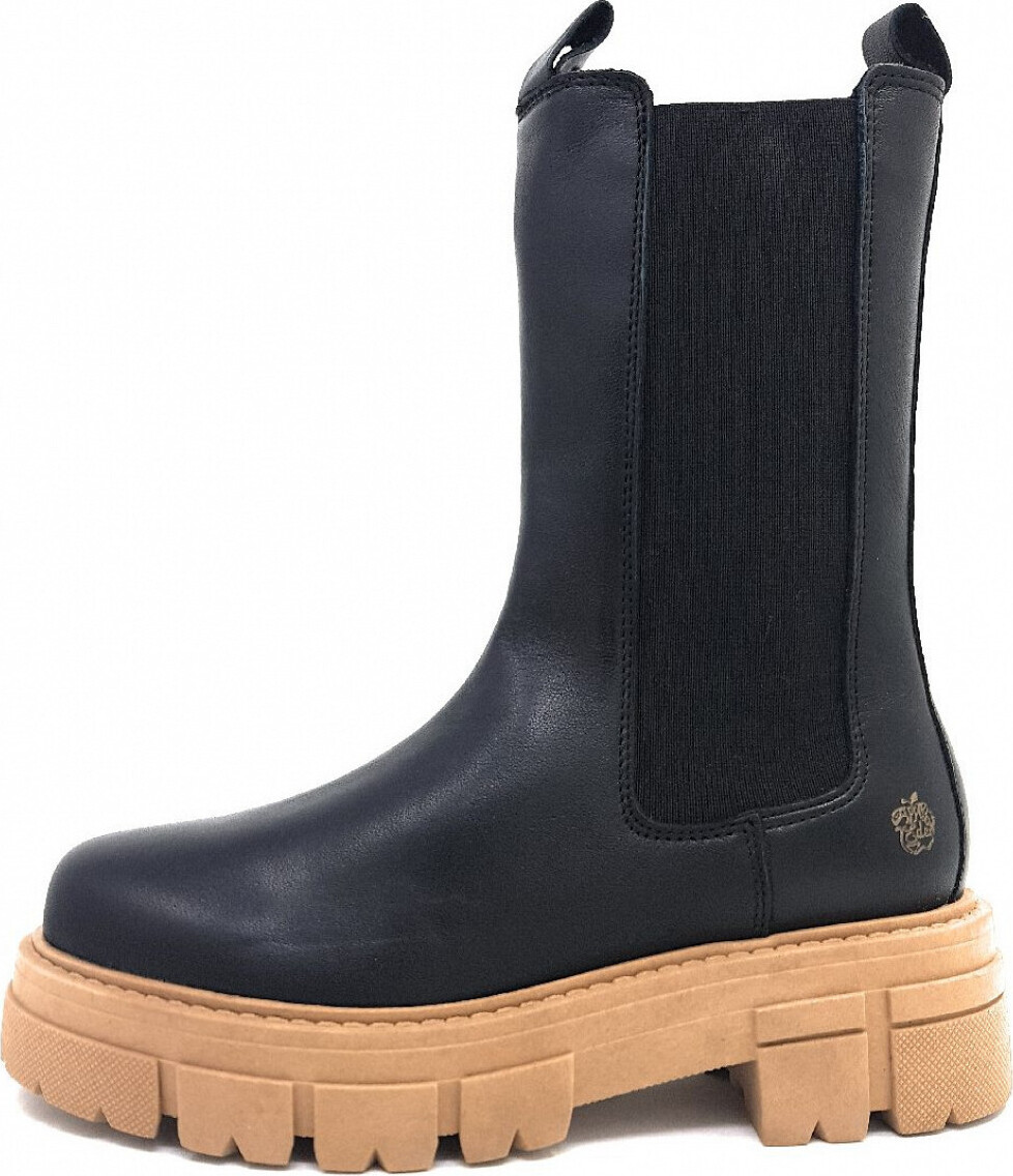 Modischer Boot für Damen in schwarz mit beige abgesezter Gummisohle. +