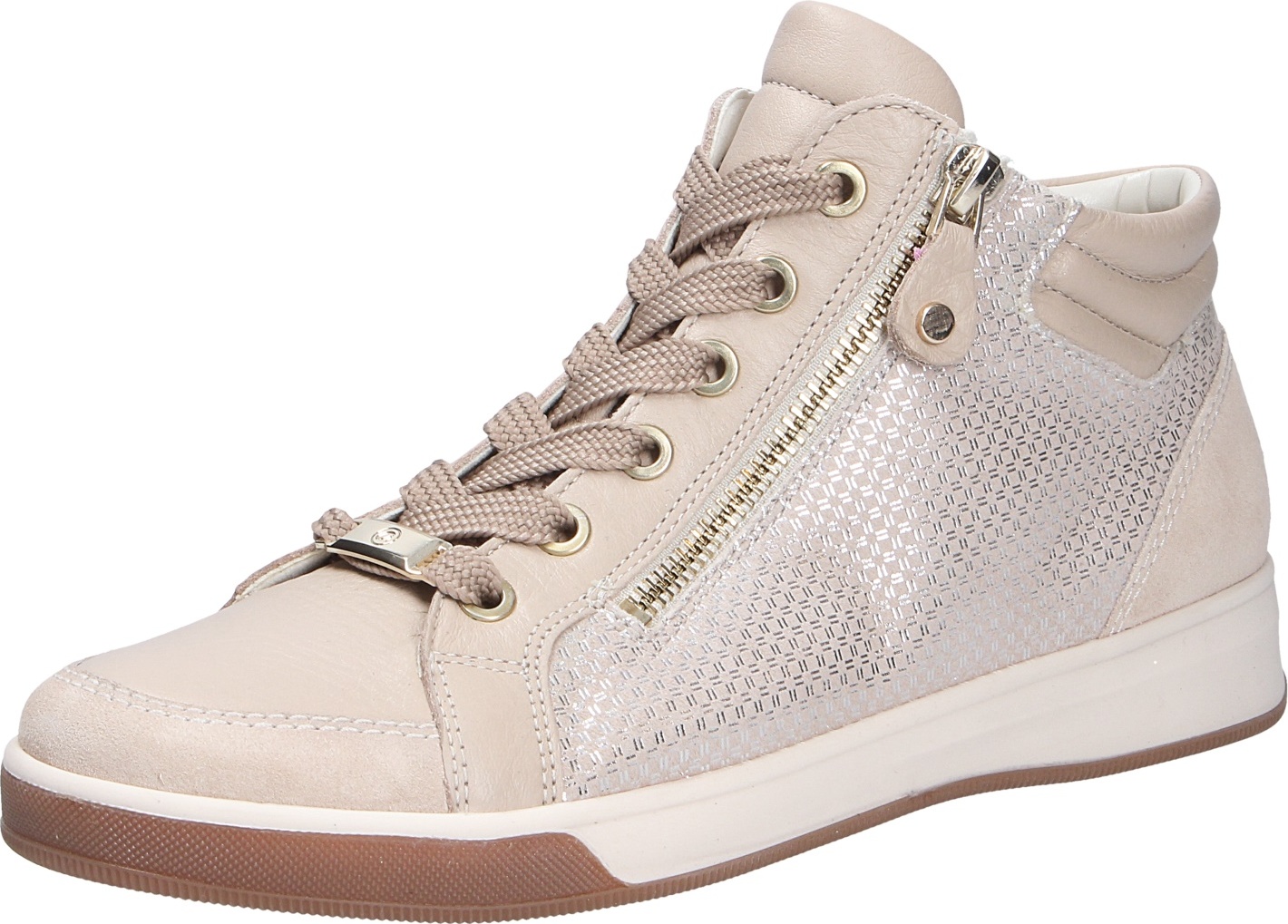 Marke: araModell-Nr.: 12-24499 25Modellname: ROM-ST-HIGH-SOFTArt: Damenschuhe - bequeme Schnür- Halbschuhe, Mid Cut SneakerFarbe: beige +, Muster in silber +, braun (shell/silber)Obermaterial: Velourleder +, Glattleder Mix (Kalbvelour, Cervocalf, Moony)Innenfutter: Textil - weich gepolstert, auf BambusbasisInnensohle: Textil Komfort Fußbett, High SoftWechselfußbett: herausnehmbare InnensohleLaufsohle: TR Synthetik =, rutschfest +, leicht +, flexibelVerschluss: Schnürung und ReißverschlussAbsatz: flach - kein AbsatzSchuhform: rundGrößenangabe: fällt normal ausWeitenangabe: G - normal Weiteinterne Artikelnummer für Ihre Rückfragen: 236-40-0128