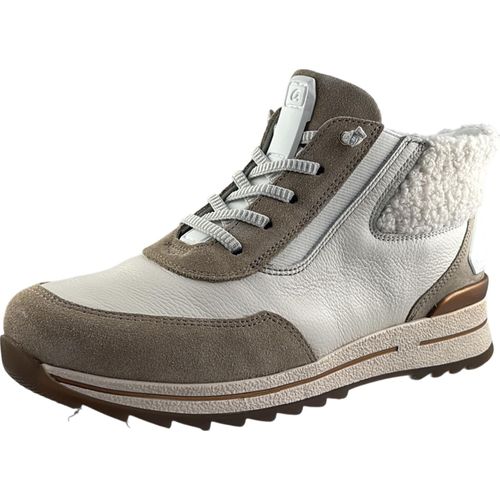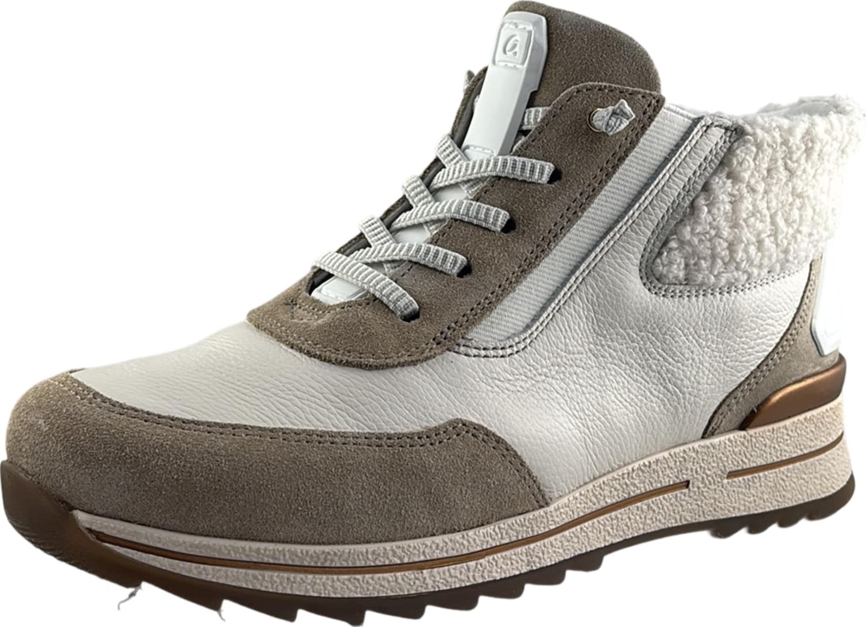 Marke: araModell-Nr.: 12-24540 08Modellname: OSAKA SPORT-STArt: Damen Stiefeletten - sportliche Stiefelette, Warmfutter Mid SneakerFarbe: cream-weiß +, beige +, Sohle in zart rose +, transparent +, bronze (sand/cream/offwhite)Obermaterial: Glattleder +, Velourleder Mix (Kalbvelour, Firenzecalf, Stretch-Einsatz, Fellkragen)Innenfutter: Warmfutter - Textil, KunstfellInnensohle: Textil Komfort Fußbett, High SoftWechselfußbett: herausnehmbare InnensohleLaufsohle: TPU Sohle - leicht, flexibel und bequemVerschluss: Gummizug - ohne VerstellmöglichkeitAbsatz: flach - kein Absatz, Keil 1,5cmSchafthöhe: Knöchelhoch, ca. +