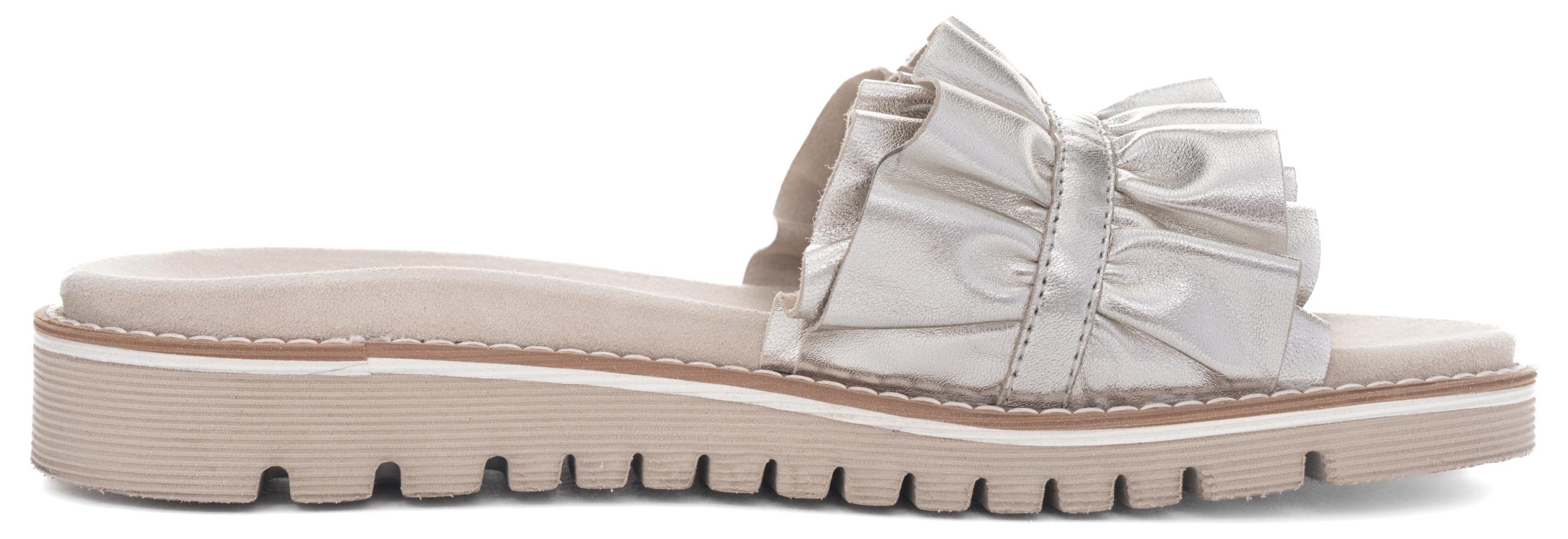 Sehr leichte Pantolette für heiße Sommertage softes, anschmiegsames Leder Innenfutter und Decksohle aus Leder bequemes, fest eingearbeitetes Fußbett HighSoft Technologie sorgt für weichen Auftritt die Rüschen sind ein echter Hingucker flexible, rutschhemmende Sohle zeitloser, femininer Schuh Pflegetipp: 4 Season Protector