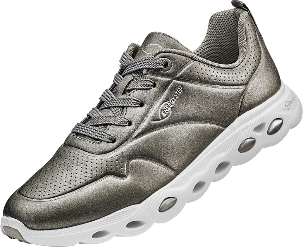 lässiger silbergrauer Schnürer robustes Obermaterial perfekte Anpassung durch die Schnürung Rundumpolsterung vermeidet schmerzhafte Druckstellen bequemes, weich gepolstertes Wechselfußbett mit Textil bezogen Textilfutter für hohen Tragekomfort perfekte Dämpfung durch Gel-Pads sehr leicht rutschhemmende Keilsohle