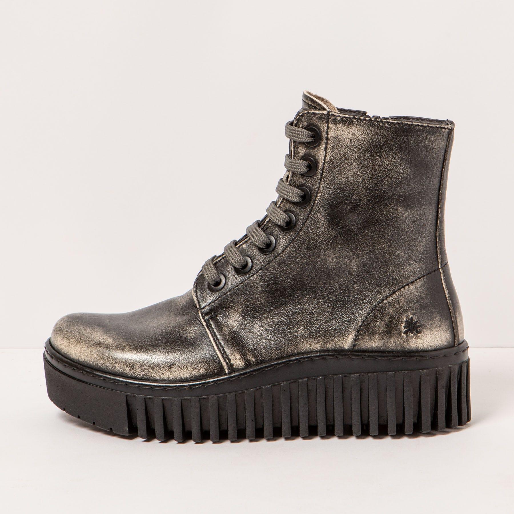 Graues Glattleder im Used-Look trifft auf eine runde Zehenpartie und eine stabile, rutschhemmende Laufsohle. Der 4 cm Plateauabsatz verlängert die Silhouette subtil, die verstärkte Ferse stabilisiert den Halt.