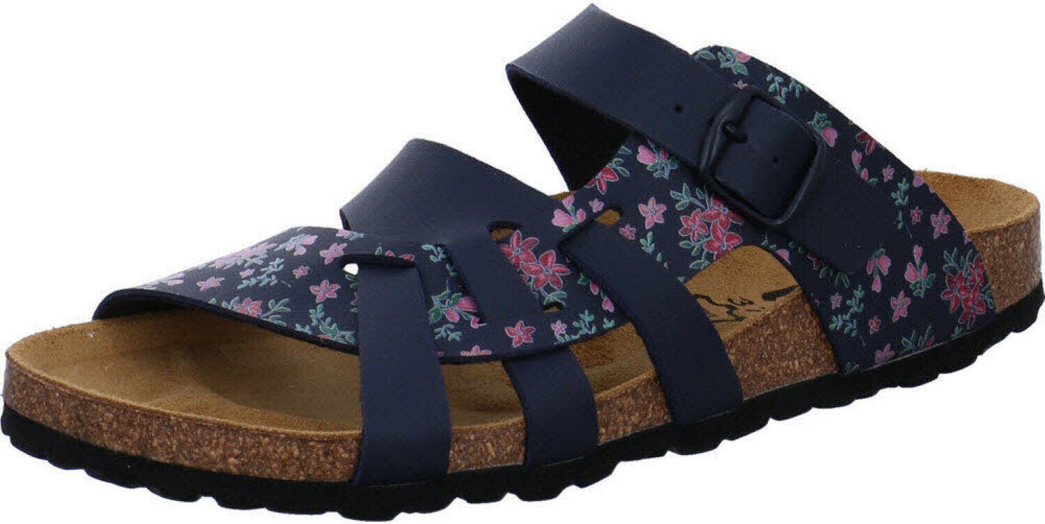 Diese praktische Damen Pantolette von BIO life ist die perfekte Wahl für Haus und Hof.Gefertigt aus pflegeleichtem Kunstleder in Blau und mit einem schönen bunten Blumen Muster versehen macht der Schuh jeden Einsatz zuverlässig und schick mit.Ob für Freizeit und Garten oder praktisch auch als Hausschuh.Für Komfort sorgen das anatomisch geformte Fußbett aus Echtleder mit Schaumeinlage, hergestellt in Spanien und die regulierbare Schnalle.
