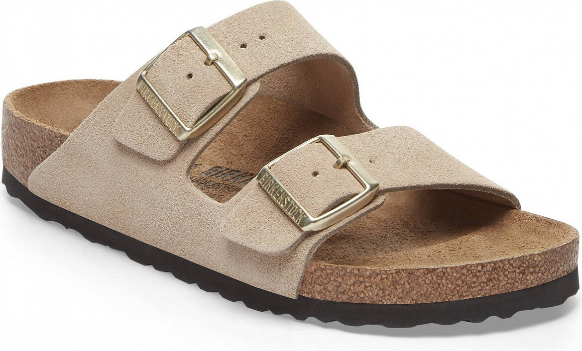 Birkenstock Arizona Suede SFB Pantolette Sommerschuh, Strandschuh, Hausschuh, Leder, schmale Schuhweite E (beige)