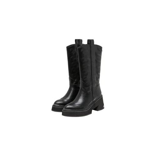 Durch die klare Konstruktion lässt sich der Stiefel sowohl zu femininen Kleidern als auch zu Denim- oder Lederkombinationen tragen und ergänzt vielseitige Outfits mit markanter Silhouette.