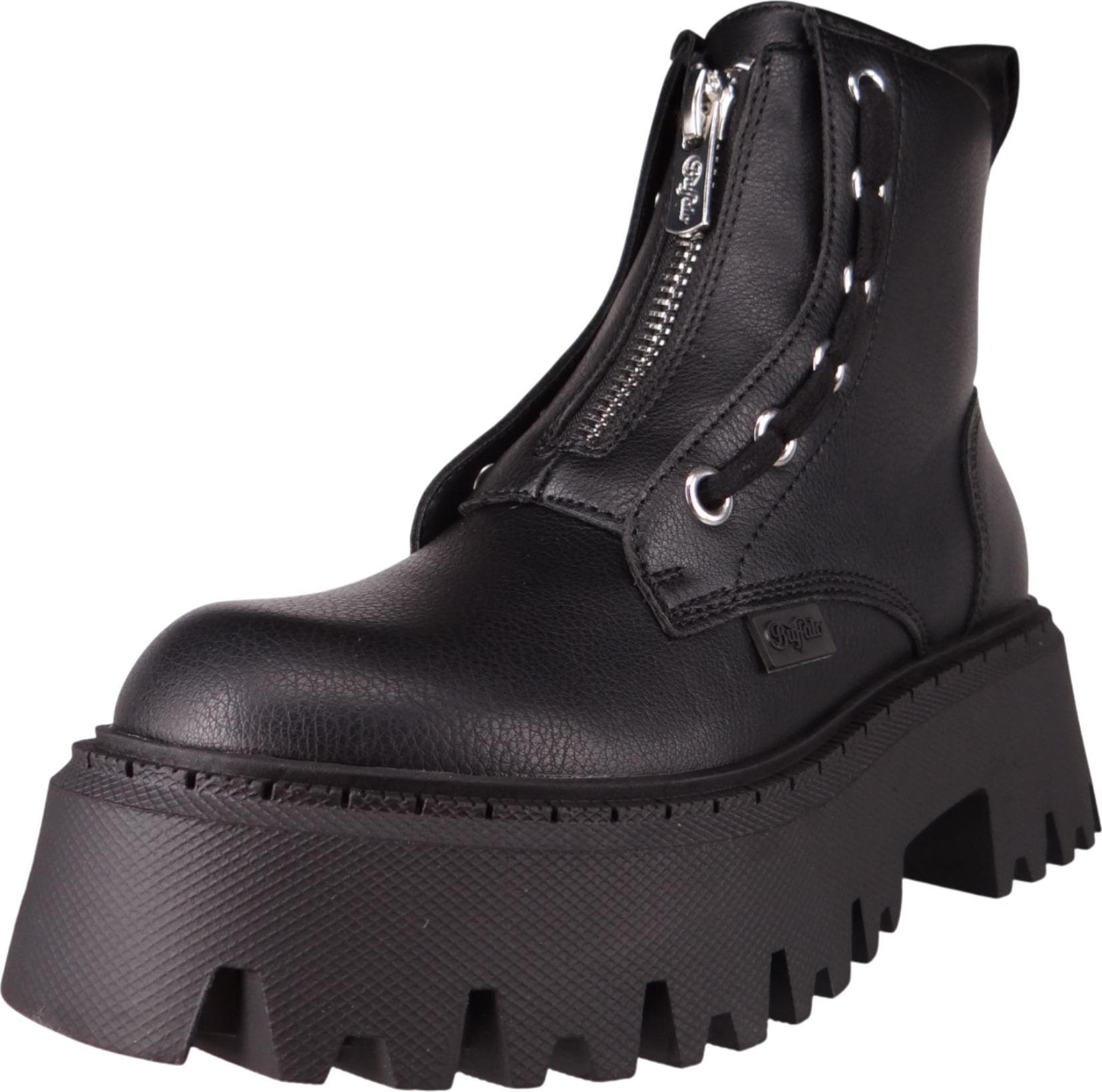 Buffalo Damen Boot aus Kunstleder in Schwarz mit Schnürung, abnehmbarem Front-Zipper, Textilfutter, Foam-Wechselfußbett aus Kunstleder und dicker Profilsohle mit Blockabsatz