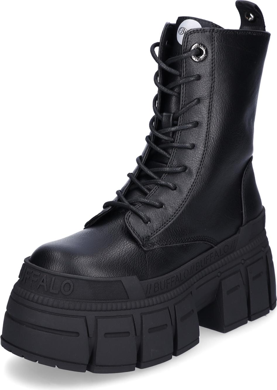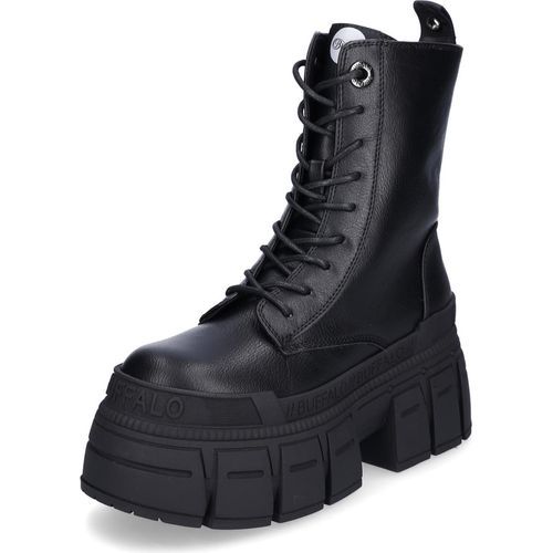Buffalo Damen Schnürboot aus schwarzem Lederimitat mit Textilfutter, Reißverschluss &, Schnürung und Plateau-Profilsohle