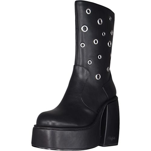 Die Oberseite zeigt glatte synthetische Nappahaptik, innen weiche, pflegeleichte Futterqualitäten und eine gepolsterte Einlegesohle für komfortable Dämpfung. Der Schaft reicht bis zur Mitte der Wade und ist mit dekorativen Ösen versehen, während ein seitlicher Reißverschluss für leichtes An- und Ausziehen sorgt, die abgerundete Vorderkappe und die erhöhte Plateau-Laufsohle stabilisieren den Schritt.