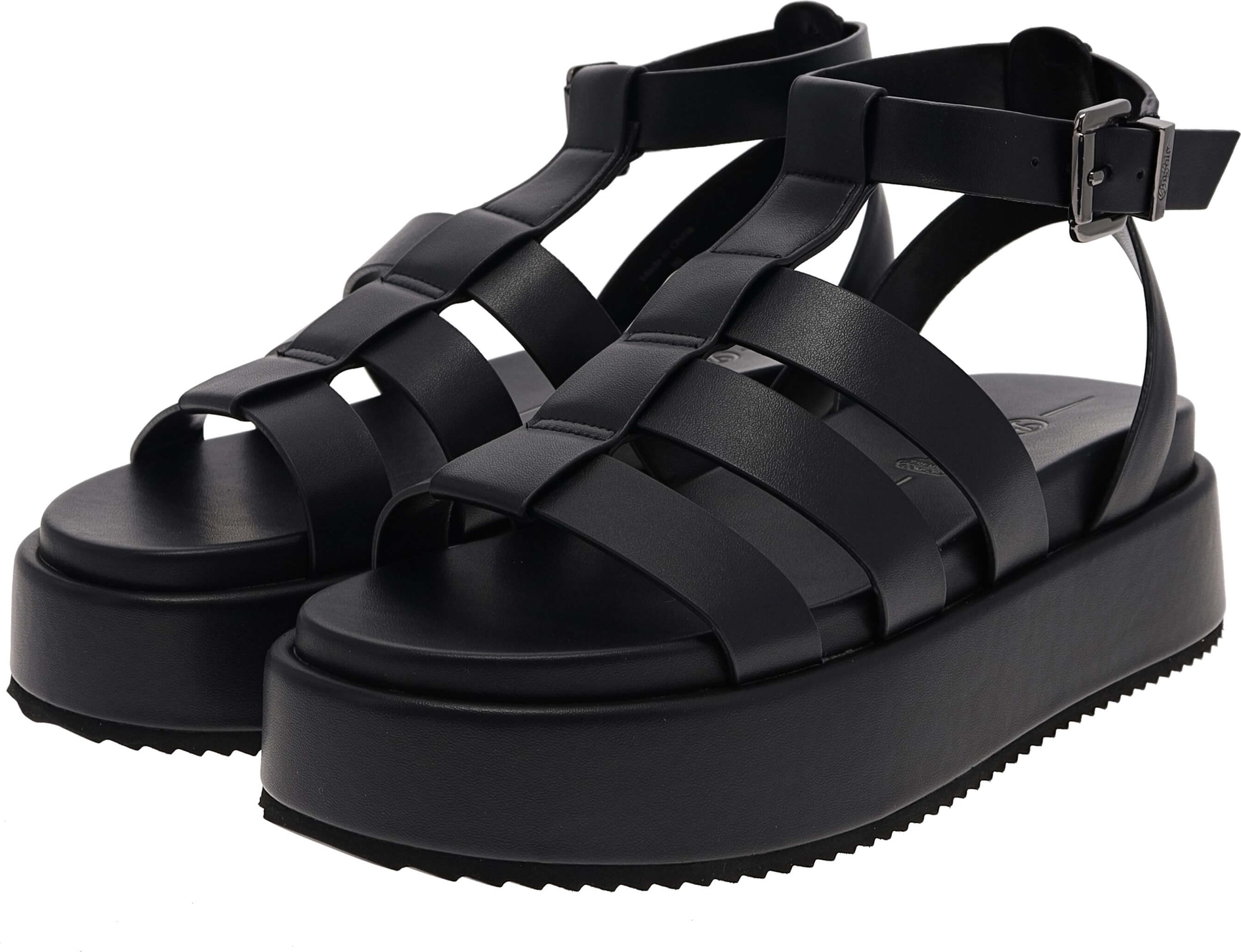 Slides mit markanter Plateausohle präsentieren sich als robuste Alltagssandale mit modernem, geflochten wirkendem Riemenaufbau und verstellbarem Fersenverschluss mit Metallschnalle, ideal für Stadt und Freizeit. +