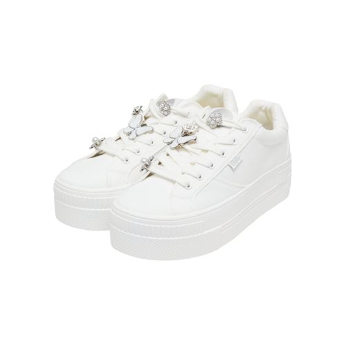 Die klassische Schnürung sitzt auf einem gepolsterten Schaft mit verstärkter Ferse und sorgt für verlässlichen Halt, während Rippbündchen am Knöchel für Komfort sorgen. Auffällige Schmuckanhänger und funkelnde Details auf dem Schnürbereich setzen modische Akzente und verleihen dem klaren, sportlich-eleganten Schnitt eine feminine Note, ideal als ergänzender Schuh für lässige Alltags- oder Ausgehoutfits.