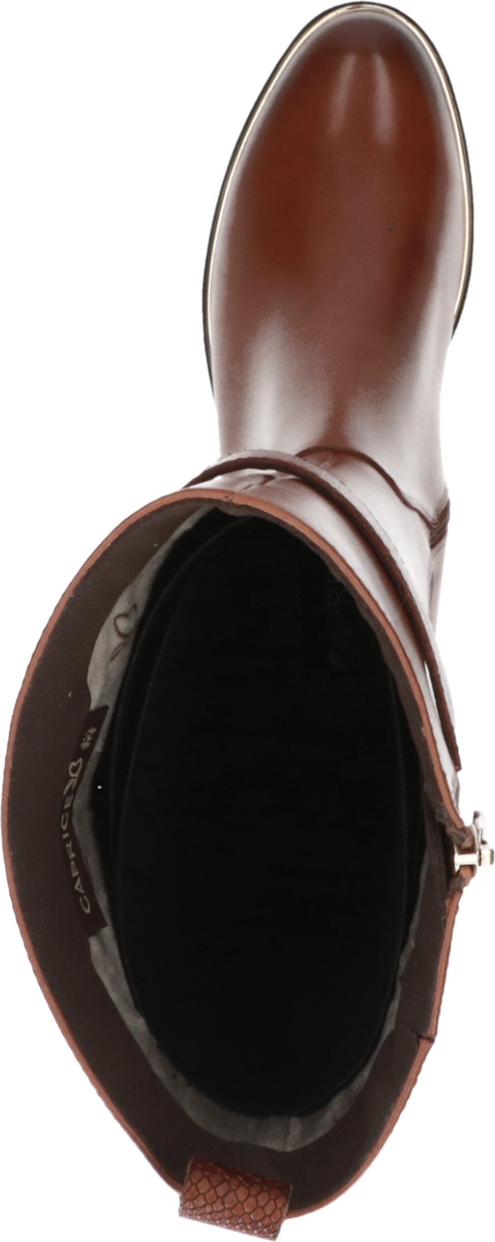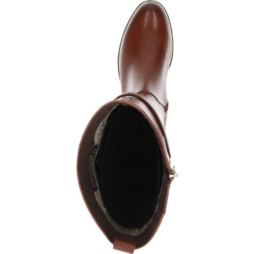 Das glatte Obermaterial verleiht ihm eine edle Ausstrahlung, während die dezente Zierschnalle am Schaft einen stilvollen Akzent setzt. Der bequeme Blockabsatz sorgt für angenehmen Tragekomfort im Alltag und macht den Stiefel vielseitig kombinierbar – ob zu Kleidern, Röcken oder Hosen.