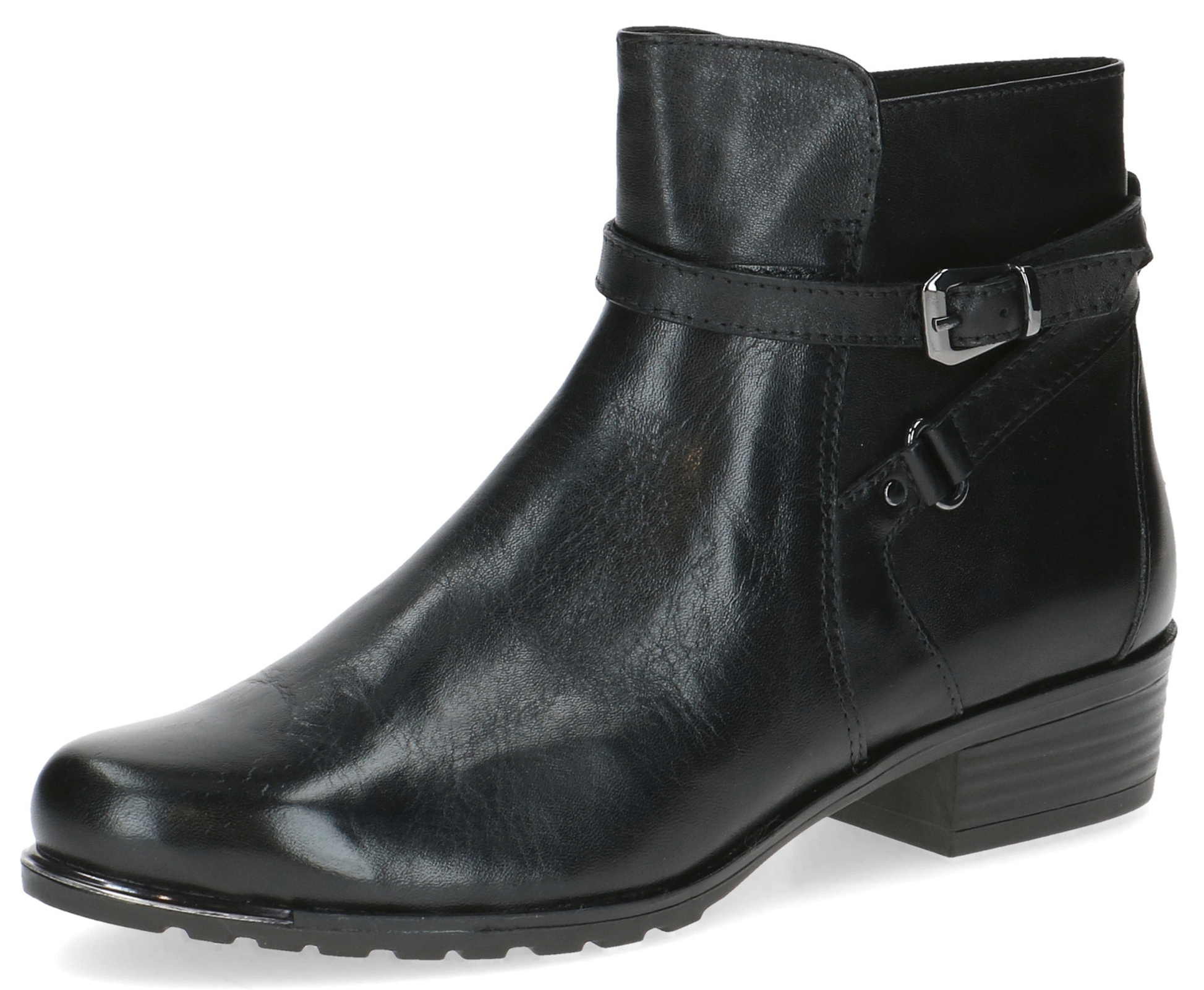 Ein besonders schönes Modell ist diese Damen Stiefelette aus der neuen Kollektion von Caprice.Gefertigt aus hochwertigem Glattleder in Schwarz, besticht das Design durch den Riemen um den Schaft welcher mit einer Schnalle in Silber verziert ist. +