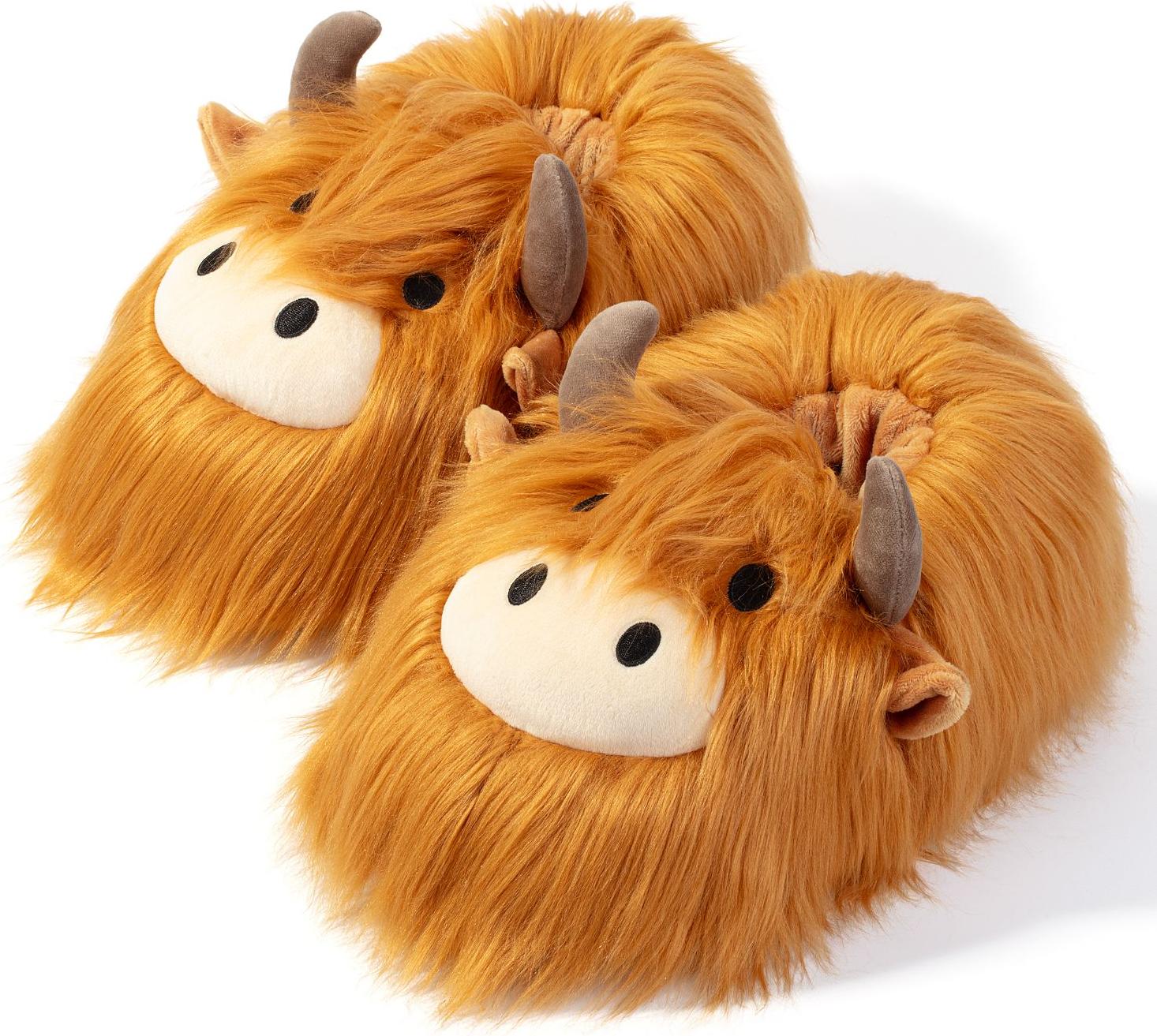 Corimori Plüsch Highland Cow Hochland-Rind Pantoffeln Plüsch Hausschuhe (Packung, Geschenk) Flauschige Highland Cow Pantoffeln, Slipper, EU Einheitsgröße 34-44 (braun)