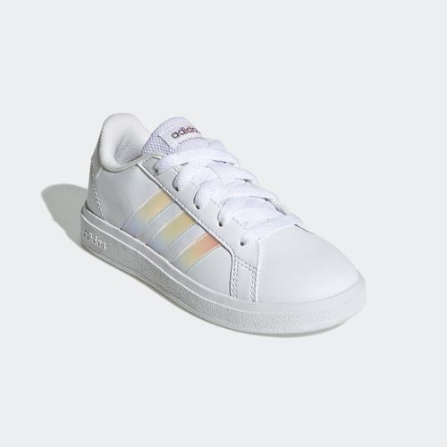 Der Grand Court 2.0 K ist ein angesagter Kinder Mädchen Sneaker von Adidas, der sich vom Tennis inspirieren lassen hat.Das Obermaterial wurde aus pflegeleichtem Kunstleder in Weiß gefertigt und wird durch die drei typischen Adidas Streifen in schillerndem Rosa abgerundet.Der weich gepolsterte Schaft bietet ein angenehmes Tragegefühl und die regulierbare Schnürung sorgt für eine hervorragende Passform.Die profilierte Laufsohle mit Wabenstruktur bietet optimalen Grip und gibt dem Schuh seinen sportiven Look.